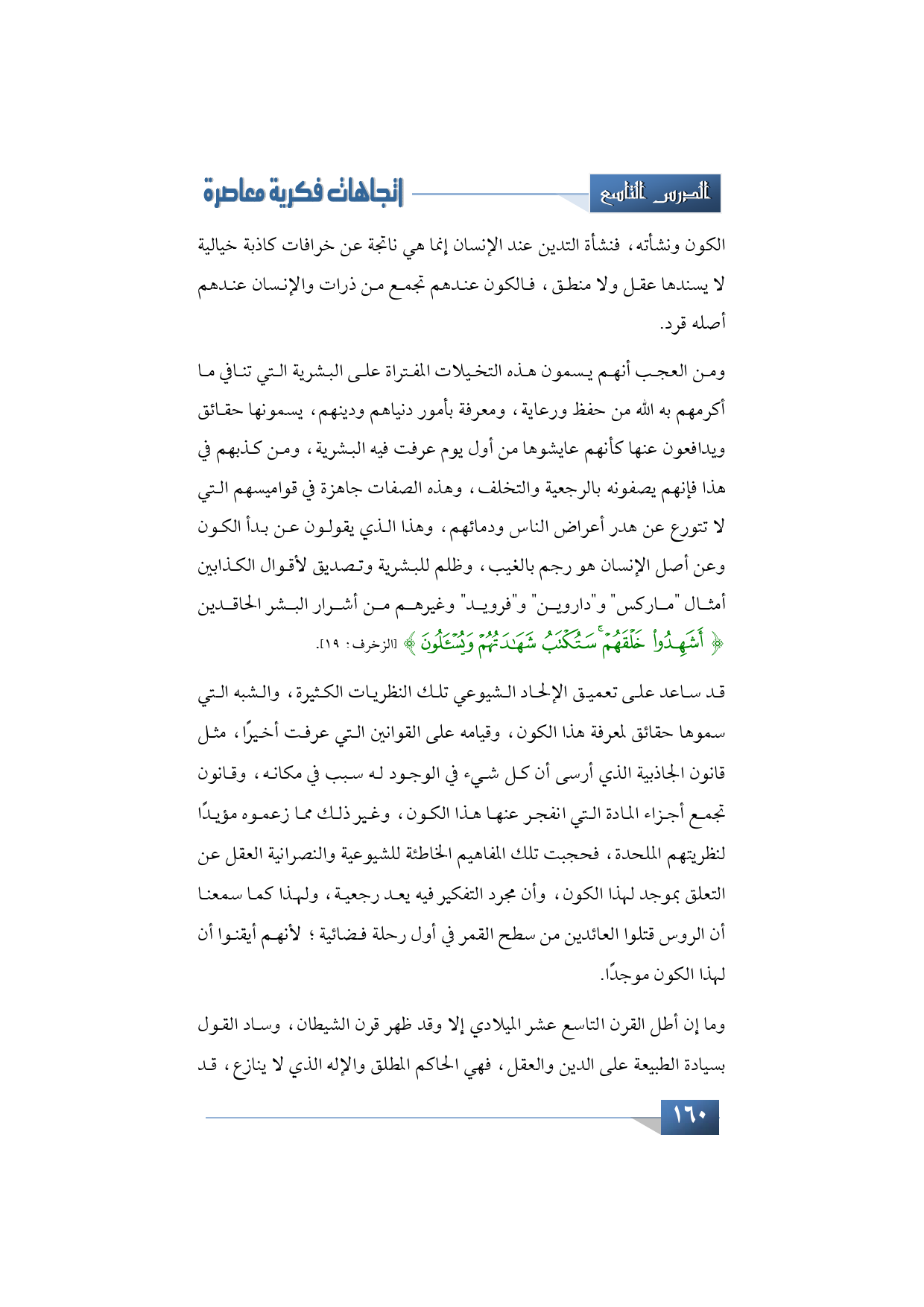 الكون ونشأته، فنشأة التدين عند الإنسان إنما هي ناتجة عن خرافات كاذبة خيالية لا يسندها عقل ولا منطق، فالكون عندهم تجمع من ذرات والإنسان عندهم أصله قرد.