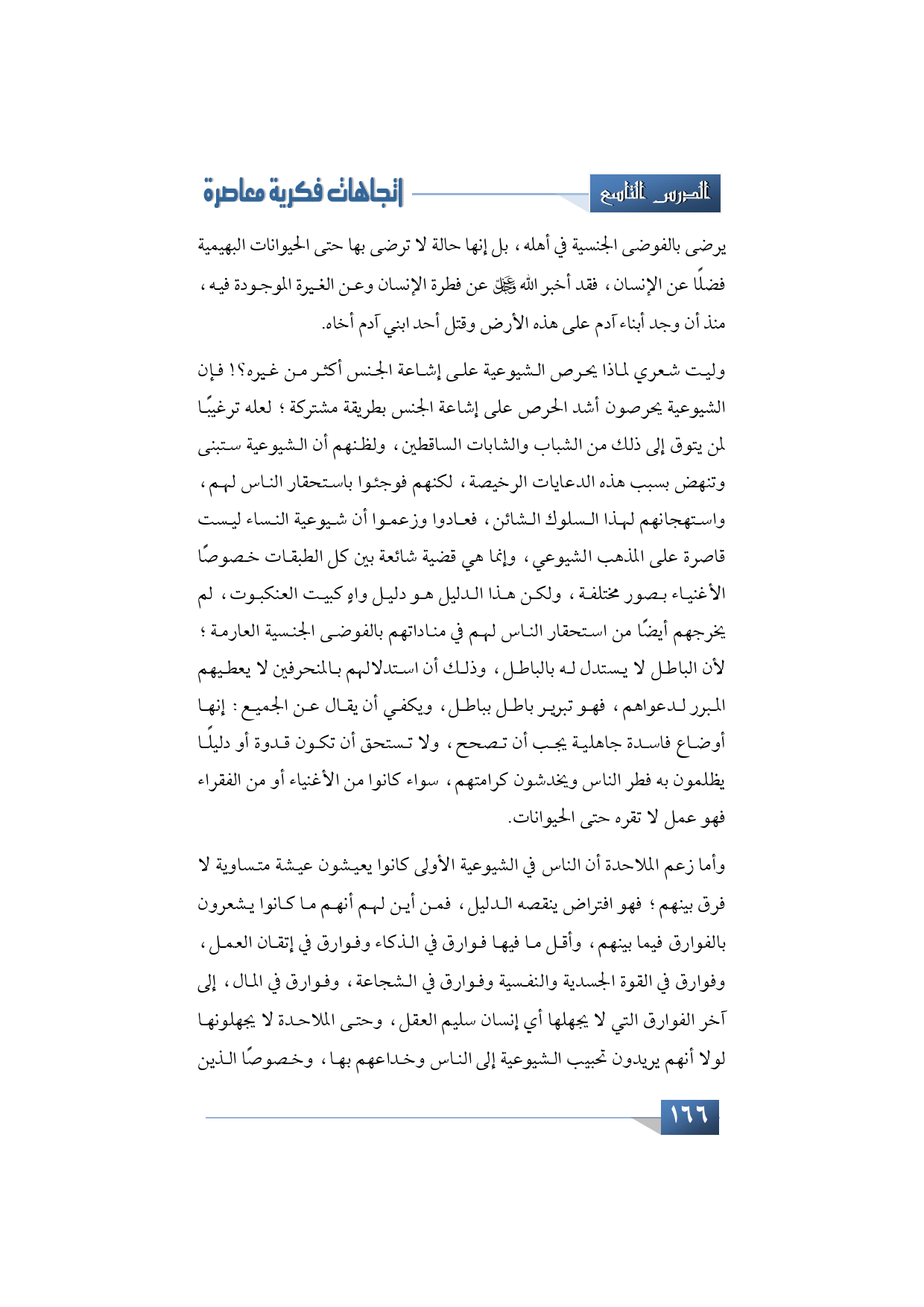 وليت شعري لماذا يحرص الشيوعية على إشاعة الجنس أكثر من غيره؟! فإن الشيوعية يحرصون أشد الحرص على إشاعة الجنس بطريقة مشتركة؛ لعله ترغيبًا لمن يتوق إلى ذلك من الشباب والشابات الساقطين، ولظنهم أن الشيوعية ستبنى وتنهض بسبب هذه الدعايات الرخيصة، لكنهم فوجئوا باستحقار الناس لهم، واستهجانهم لهذا السلوك الشائن، فعادوا وزعموا أن شيوعية النساء ليست قاصرة على المذهب الشيوعي، وإنما هي قضية شائعة بين كل الطبقات خصوصًا الأغنياء بصور مختلفة، ولكن هذا الدليل هو دليل واهٍ كبيت العنكبوت، لم يخرجهم أيضًا من استحقار الناس لهم في مناداتهم بالفوضى الجنسية العارمة؛ لأن الباطل لا يستدل له بالباطل، وذلك أن استدلالهم بالمنحرفين لا يعطيهم المبرر لدعواهم، فهو تبرير باطل بباطل، ويكفي أن يقال عن الجميع: إنها أوضاع فاسدة جاهلية يجب أن تصحح، ولا تستحق أن تكون قدوة أو دليلًا يظلمون به فطر الناس ويخدشون كرامتهم، سواء كانوا من الأغنياء أو من الفقراء فهو عمل لا تقره حتى الحيوانات.