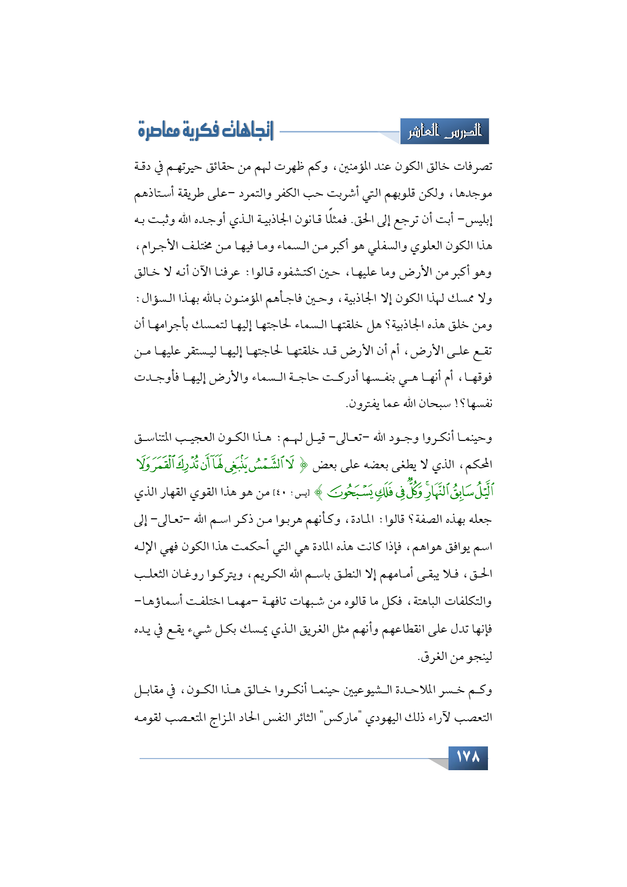 تصرفات خالق الكون عند المؤمنين، وكم ظهرت لهم من حقائق حيرتهم في دقة موجدها، ولكن قلوبهم التي أشربت حب الكفر والتمرد -على طريقة أستاذهم إبليس- أبت أن ترجع إلى الحق. فمثلًا قانون الجاذبية الذي أوجده الله وثبت به هذا الكون العلوي والسفلي هو أكبر من السماء وما فيها من مختلف الأجرام، وهو أكبر من الأرض وما عليها، حين اكتشفوه قالوا: عرفنا الآن أنه لا خالق ولا ممسك لهذا الكون إلا الجاذبية، وحين فاجأهم المؤمنون بالله بهذا السؤال: ومن خلق هذه الجاذبية؟ هل خلقتها السماء لحاجتها إليها لتمسك بأجرامها أن تقع على الأرض، أم أن الأرض قد خلقتها لحاجتها إليها ليستقر عليها من فوقها، أما أنها هي بنفسها أدركت حاجة السماء والأرض إليها فأوجدت نفسها؟! سبحان الله عما يفترون.