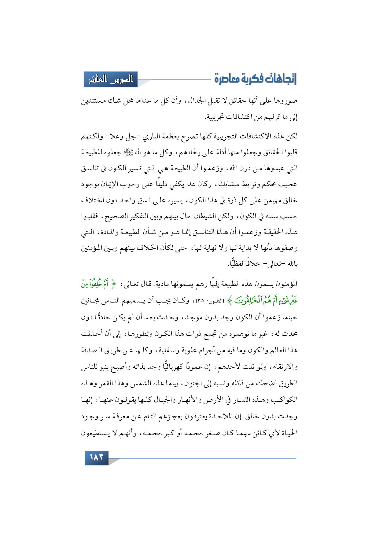 لكن هذه الاكتشافات التجريبية كلها تصرح بعظمة الباري جل وعلا، ولكنهم قلبوا الحقائق وجعلوا منها أدلة على إلحادهم، وكل ما هو لله سبحانه وتعالى جعلوه للطبيعة التي عبدوها من دون الله، وزعموا أن الطبيعة هي التي تسير الكون في تناسق عجيب محكم وترابط متشابك، وكان هذا يكفي دليلًا على وجوب الإيمان بوجود خالق مهيمن على كل ذرة في هذا الكون، يسيره على نسق واحد دون اختلاف حسب سننه في الكون، ولكن الشيطان حال بينهم وبين التفكير الصحيح، فقلبوا هذه الحقيقة وزعموا أن هذا التناسق إنما هو من شأن الطبيعة والمادة، التي وصفوها بأنها لا بداية لها ولا نهاية لها، حتى لكأن الخلاف بينهم وبين المؤمنين بالله تعالى خلافًا لفظيًّا.