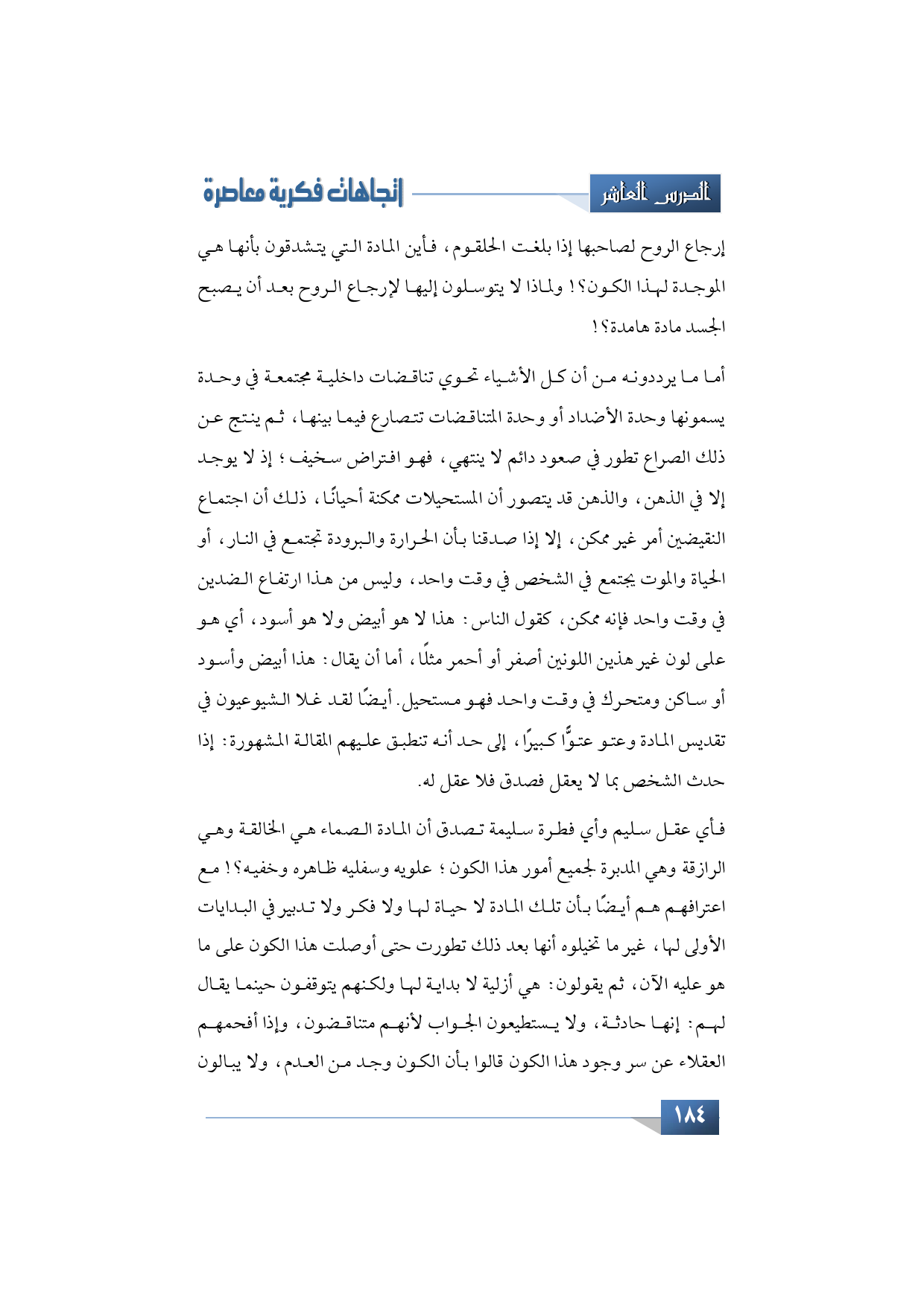 أما ما يرددونه من أن كل الأشياء تحوي تناقضات داخلية مجتمعة في وحدة يسمونها وحدة الأضداد أو وحدة المتناقضات تتصارع فيما بينها، ثم ينتج عن ذلك الصراع تطور في صعود دائم لا ينتهي، فهو افتراض سخيف؛ إذ لا يوجد إلا في الذهن، والذهن قد يتصور أن المستحيلات ممكنة أحيانًا، ذلك أن اجتماع النقيضين أمر غير ممكن، إلا إذا صدقنا بأن الحرارة والبرودة تجتمع في النار، أو الحياة والموت يجتمع في الشخص في وقت واحد، وليس من هذا ارتفاع الضدين في وقت واحد فإنه ممكن، كقول الناس: هذا لا هو أبيض ولا هو أسود، أي هو على لون غير هذين اللونين أصفر أو أحمر مثلًا، أما أن يقال: هذا أبيض وأسود أو ساكن ومتحرك في وقت واحد فهو مستحيل. أيضًا لقد غلا الشيوعيون في تقديس المادة وعتو عتوًّا كبيرًا، إلى حد أنه تنطبق عليهم المقالة المشهورة: إذا حدث الشخص بما لا يعقل فصدق فلا عقل له.