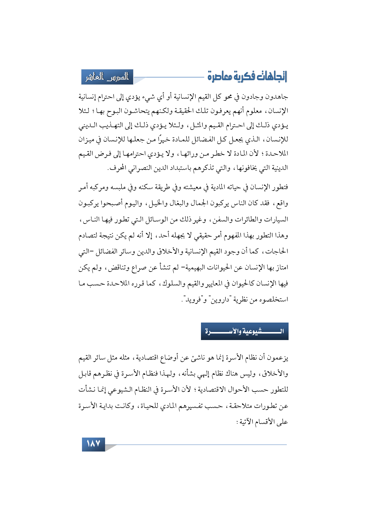 جاهدون وجادون في محو كل القيم الإنسانية أو أي شيء يؤدي إلى احترام إنسانية الإنسان، معلوم أنهم يعرفون تلك الحقيقة ولكنهم يتحاشون البوح بها؛ لئلا يؤدي ذلك إلى احترام القيم والمثل، ولئلا يؤدي ذلك إلى التهذيب الديني للإنسان، الذي يجعل كل الفضائل للمادة خيرًا من جعلها للإنسان في ميزان الملاحدة؛ لأن المادة لا خطر من ورائها، ولا يؤدي احترامها إلى فرض القيم الدينية التي يخافونها، والتي تذكرهم باستبداد الدين النصراني المحرف.