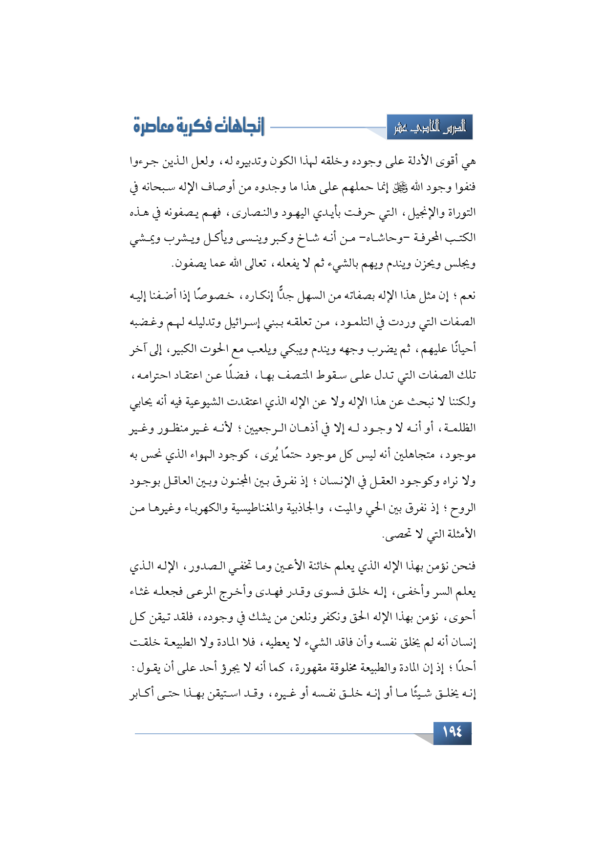 نعم؛ إن مثل هذا الإله بصفاته من السهل جدًّا إنكاره، خصوصًا إذا أضفنا إليه الصفات التي وردت في التلمود، من تعلقه ببني إسرائيل وتدليله لهم وغضبه أحيانًا عليهم، ثم يضرب وجهه ويندم ويبكي ويلعب مع الحوت الكبير، إلى آخر تلك الصفات التي تدل على سقوط المتصف بها، فضلًا عن اعتقاد احترامه، ولكننا لا نبحث عن هذا الإله ولا عن الإله الذي اعتقدت الشيوعية فيه أنه يحابي الظلمة، أو أنه لا وجود له إلا في أذهان الرجعيين لأنه غير منظور وغير موجود، متجاهلين أنه ليس كل موجود حتمًا يُرى، كوجود الهواء الذي نحس به ولا نراه وكوجود العقل في الإنسان، إذ نفرق بين المجنون وبين العاقل بوجود الروح إذ نفرق بين الحي والميت، والجاذبية والمغناطيسية والكهرباء وغيرها من الأمثلة التي لا تحصى.