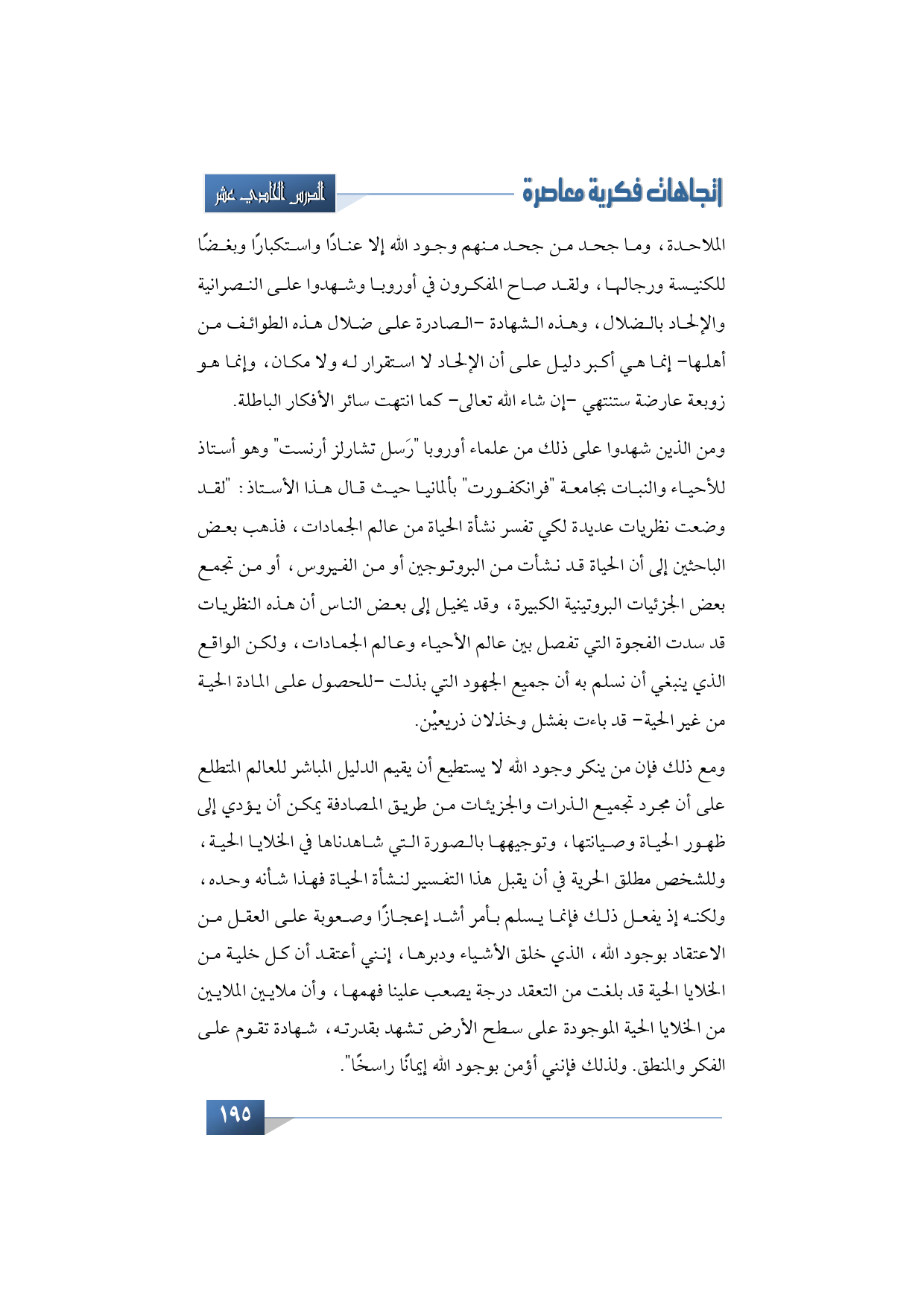 ومع ذلك فإن من ينكر وجود الله لا يستطيع أن يقيم الدليل المباشر للعالم المتطلع على أن مجرد تجميع الذرات والجزيئات من طريق المصادفة يمكن أن يؤدي إلى ظهور الحياة وصيانتها، وتوجيهها بالصورة التي شاهدناها في الخلايا الحية، وللشخص مطلق الحرية في أن يقبل هذا التفسير لنشأة الحياة فهذا شأنه وحده، ولكنه إذ يفعل ذلك فإنما يسلم بأمر أشد إعجازًا وصعوبة على العقل من الاعتقاد بوجود الله، الذي خلق الأشياء ودبرها، إنني أعتقد أن كل خلية من الخلايا الحية قد بلغت من التعقد درجة يصعب علينا فهمها، وأن ملايين الملايين من الخلايا الحية الموجودة على سطح الأرض تشهد بقدرته، شهادة تقوم على الفكر والمنطق. ولذلك فإنني أؤمن بوجود الله إيمانًا راسخًا".