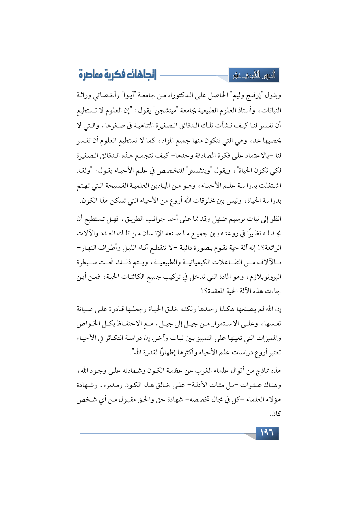 ويقول "إرفنج وليم" الحاصل على الدكتوراه من جامعة "أيوا" وأخصائي وراثة النباتات، وأستاذ العلوم الطبيعية بجامعة "ميتشجن" يقول: "إن العلوم لا تستطيع أن تفسر لنا كيف نشأت تلك الدقائق الصغيرة المتناهية في صغرها، والتي لا يحصيها عد، وهي التي تتكون منها جميع المواد، كما لا تستطيع العلوم أن تفسر لنا -بالاعتماد على فكرة المصادفة وحدها- كيف تتجمع هذه الدقائق الصغيرة لكي تكون الحياة"، ويقول "وينشستر" المتخصص في علم الأحياء يقول: "ولقد اشتغلت بدراسة علم الأحياء، وهو من الميادين العلمية الفسيحة التي تهتم بدراسة الحياة، وليس بين مخلوقات الله أروع من الأحياء التي تسكن هذا الكون.