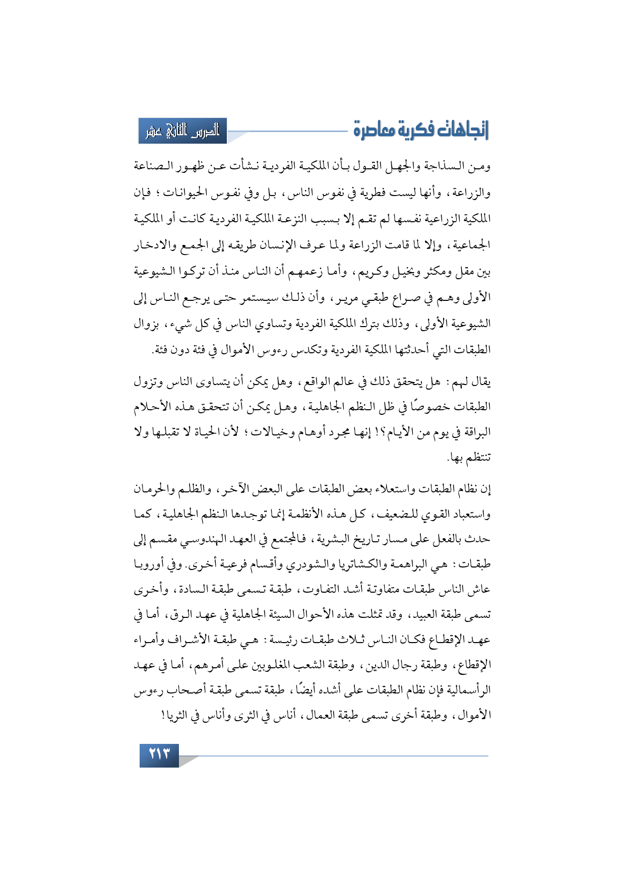 ومن السذاجة والجهل القول بأن الملكية الفردية نشأت عن ظهور الصناعة والزراعة، وأنها ليست فطرية في نفوس الناس، بل وفي نفوس الحيوانات؛ فإن الملكية الزراعية نفسها لم تقم إلا بسبب النزعة الملكية الفردية كانت أو الملكية الجماعية، وإلا لما قامت الزراعة ولما عرف الإنسان طريقه إلى الجمع والادخار بين مقل ومكثر وبخيل وكريم، وأما زعمهم أن الناس منذ أن تركوا الشيوعية الأولى وهم في صراع طبقي مرير، وأن ذلك سيستمر حتى يرجع الناس إلى الشيوعية الأولى، وذلك بترك الملكية الفردية وتساوي الناس في كل شيء، بزوال الطبقات التي أحدثتها الملكية الفردية وتكدس رؤوس الأموال في فئة دون فئة.