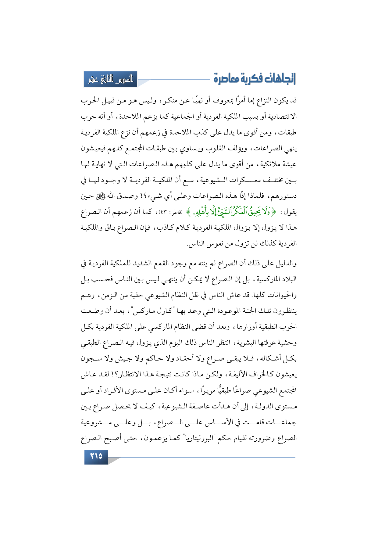 قد يكون النزاع إما أمر بمعروف أو نهي عن منكر، وليس هو من قبيل الحرب الاقتصادية أو بسبب الملكية الفردية أو الجماعية كما يزعم الملاحدة، أو أنه حرب طبقات، ومن أقوى ما يدل على كذب الملاحدة في زعمهم أن نزع الملكية الفردية ينهي الصراعات، ويؤلف القلوب ويساوي بين طبقات المجتمع كلهم فيعيشون عيشة ملائكية، من أقوى ما يدل على كذبهم هذه الصراعات التي لا نهاية لها بين مختلف معسكرات الشيوعية، مع أن الملكية الفردية لا وجود لها في دستورهم، فلماذا إذًا هذه الصراعات وعلى أي شيء؟! وصدق الله -عز وجل- حين يقول: {وَلَا يَحِيقُ الْمَكْرُ السَّيِّئُ إِلَّا بِأَهْلِهِ} (فاطر: 43)، كما أن زعمهم أن الصراع هذا لا يزول إلا بزوال الملكية الفردية كلام كاذب، فإن الصراع باق والملكية الفردية كذلك لن تزول من نفوس الناس.