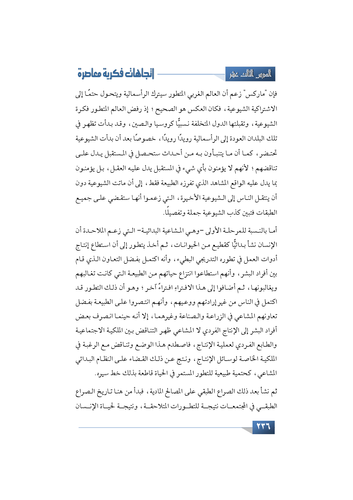 ثم نشأ بعد ذلك الصراع الطبقي على المصالح المادية، فبدأ من هنا تاريخ الصراع الطبقي في المجتمعات نتيجة للتطورات المتلاحقة، ونتيجة لحياة الإنسان