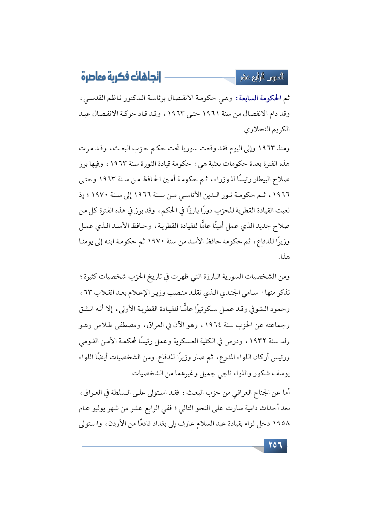 ومنذ 1963 وإلى اليوم فقد وقعت سوريا تحت حكم حزب البعث، وقد مرت هذه الفترة بعدة حكومات بعثية هي: حكومة قيادة الثورة سنة 1963، وفيها برز صلاح البيطار رئيسًا للوزراء، ثم حكومة أمين الحافظ من سنة 1963 وحتى 1966، ثم حكومة نور الدين الأتاسي من سنة 1966 إلى سنة 1970، إذ لعبت القيادة القطرية للحزب دورًا بارزًا في الحكم، وقد برز في هذه الفترة كل من صلاح جديد الذي عمل أمينًا عامًّا للقيادة القطرية، وحافظ الأسد الذي عمل وزيرًا للدفاع، ثم حكومة حافظ الأسد من سنة 1970 ثم حكومة ابنه وإلى يومنا هذا.