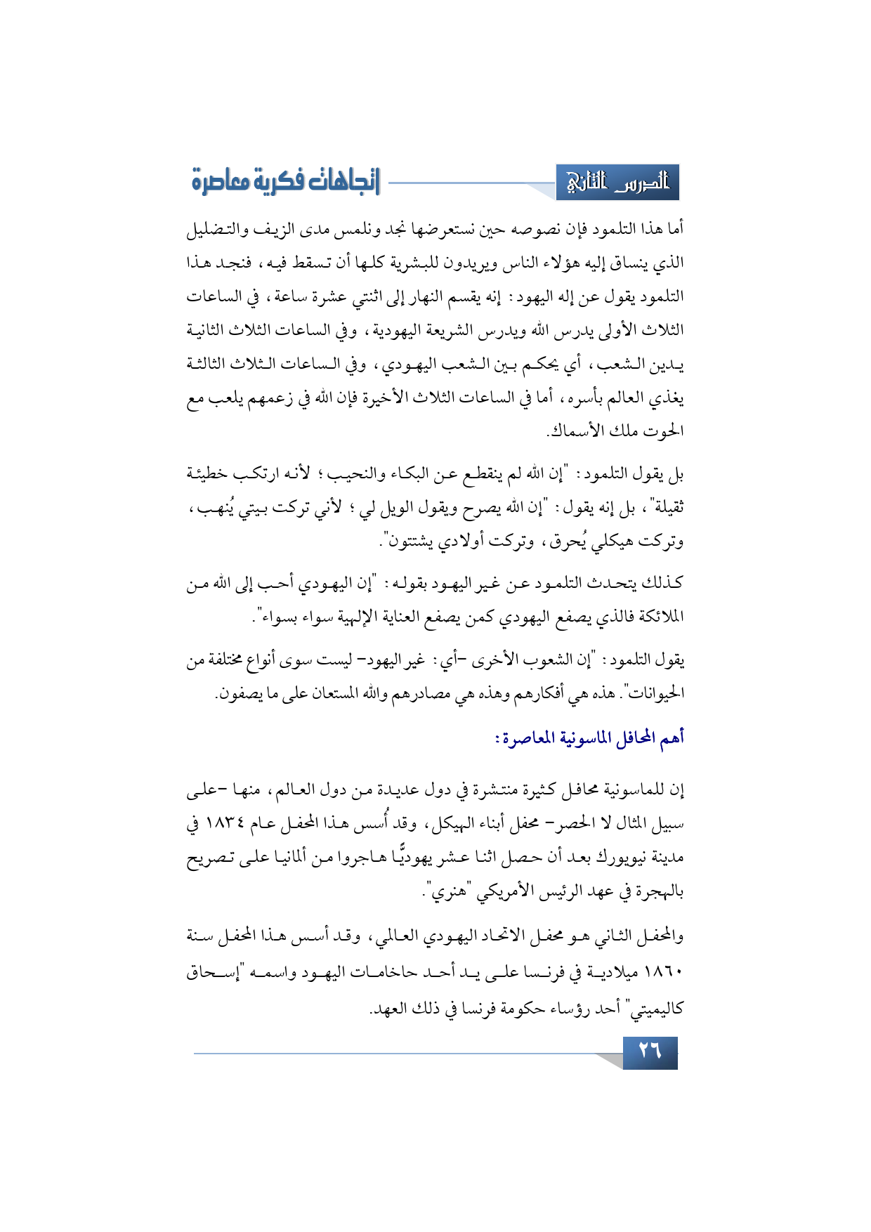 أما هذا التلمود فإن نصوصه حين نستعرضها نجد ونلمس مدى الزيف والتضليل الذي ينساق إليه هؤلاء الناس ويريدون للبشرية كلها أن تسقط فيه، فنجد هذا التلمود يقول عن إله اليهود: إنه يقسم النهار إلى اثنتي عشر ة ساعة، في الساعات الثلاث الأولى ي در س الله ويدرس الشريعة اليهودية، وفي الساعات الثلاث الثانية يدين الشعب، أي يحكم بين الشعب اليهودي، وفي الساعات الثلاث الثالثة يغذي العالم بأسره، أما في الساعات الثلاث الأخيرة فإن الله في زعمهم يلعب مع الحوت ملك الأسماك.