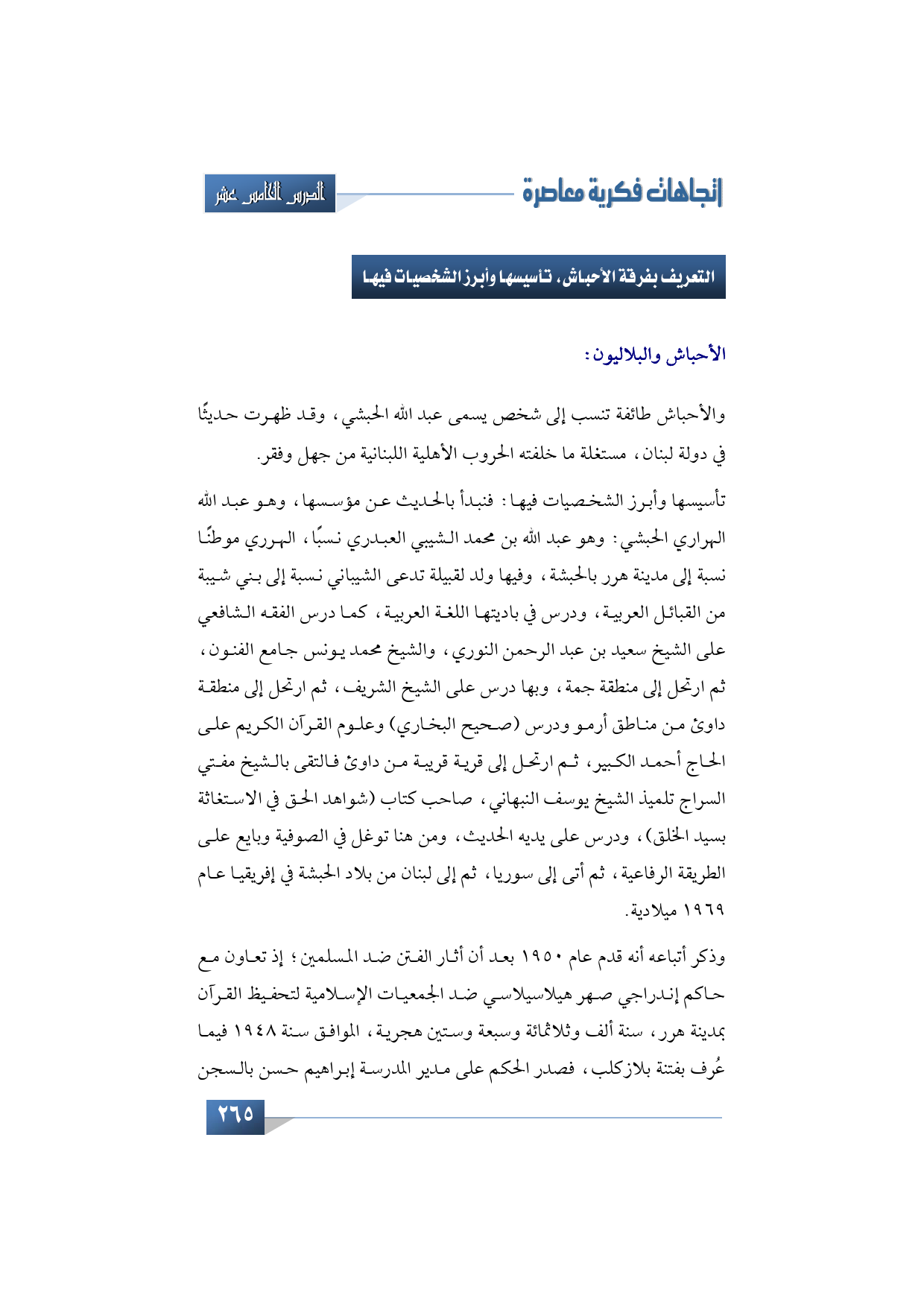 تأسيسها وأبرز الشخصيات فيها: فنبدأ بالحديث عن مؤسسها، وهو عبد الله الهراري الحبشي: وهو عبد الله بن محمد الشيبي العبدري نسبًا، الهراري موطنًا نسبة إلى مدينة هرر بالحبشة، وفيها ولد لقبيلة تدعى الشيباني نسبة إلى بني شيبة من القبائل العربية، ودرس في باديتها اللغة العربية، كما درس الفقه الشافعي على الشيخ سعيد بن عبد الرحمن النوري، والشيخ محمد يونس جامع الفنون، ثم ارتحل إلى منطقة جمة، وبها درس على الشيخ الشريف، ثم ارتحل إلى منطقة داوئ من مناطق أرمو ودرس (صحيح البخاري) وعلوم القرآن الكريم على الحاج أحمد الكبير، ثم ارتحل إلى قرية قريبة من داوئ فالتقى بالشيخ مفتي السراج تلميذ الشيخ يوسف النبهاني، صاحب كتاب (شواهد الحق في الاستغاثة بسيد الخلق)، ودرس على يديه الحديث، ومن هنا توغل في الصوفية وبايع على الطريقة الرفاعية، ثم أتى إلى سوريا، ثم إلى لبنان من بلاد الحبشة في إفريقيا عام 1969 ميلادية.