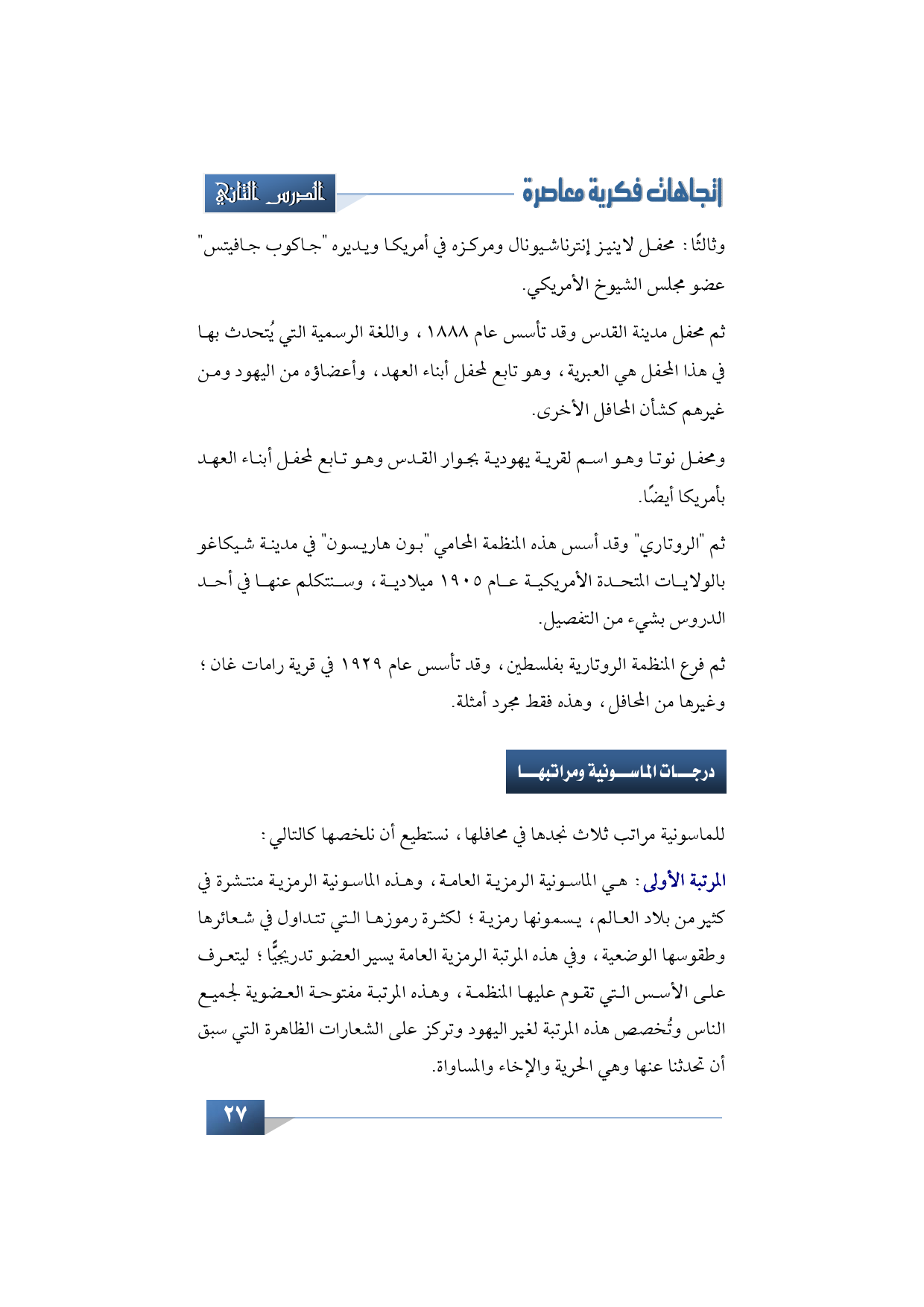 وثالث ً امحفل لاينيز إنترناشيونال ومركزه في أمريكا ويديره " جاكوب جافيتس " عضو مجلس الشيوخ الأمريكي، ثم محفل مدينة القدس قد تأسس عام 1888 واللغة الرسمية التي يُتحدث بها في هذا المحفل هي العبرية، وهو تابع لمحفل أبناء العهد، وأعضا ؤ هـ من اليهود ومن غيرهم كشأن المحافل الأخرى، ومحفل نوتا وهو اسم لقرية يهودية بجوار القدس وهو تابع لمحفل أبناء العهد بأمريكا أيضًا، ثم "الروتاري " وقد أسس هذه المنظمة المحامي " بون هاريسون " في مدينة شيكاغو بالولايات المتحدة الأمريكية عام 1905 ميلادية، وسنتكلم عنها في أحد الدروس بشيء من التفصيل، ثم فرع المنظمة الروتارية بفلسطين، وقد تأسس عام 1929 في قرية رامات غان؛ وغيرها من المحافل، وهذه فقط مجرد أمثلة.