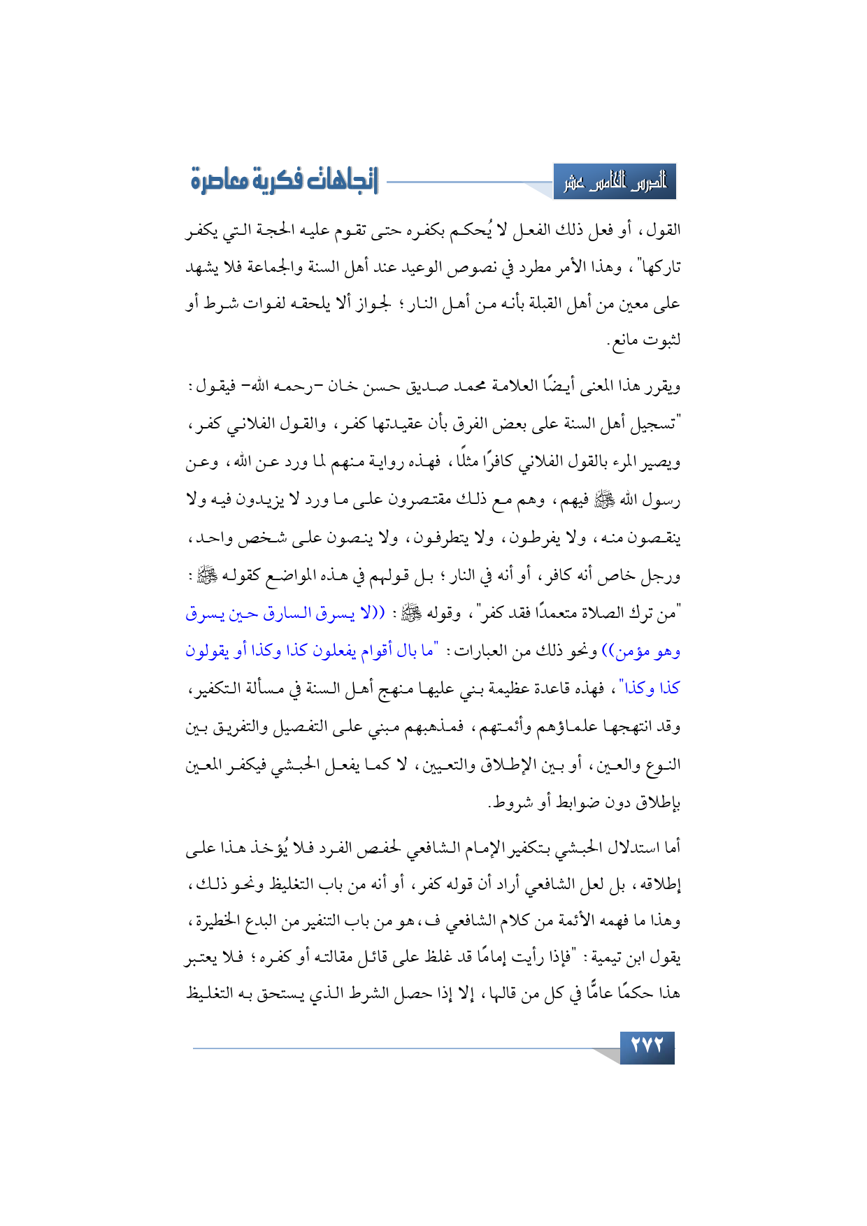 ويقرر هذا المعنى أيضًا العلامة محمد صديق حسن خان -رحمه الله- فيقول: "تسجيل أهل السنة على بعض الفرق بأن عقيدتها كفر، والقول الفلاني كفر، ويصير المرء بالقول الفلاني كافرًا مثلًا، فهذه رواية منهم لما ورد عن الله، وعن رسول الله -صلى الله عليه وسلم- فيهم، وهم مع ذلك مقتصرون على ما ورد لا يزيدون فيه ولا ينقصون منه، ولا يفرطون، ولا يتطرفون، ولا ينصون على شخص واحد، ورجل خاص أنه كافر، أو أنه في النار؛ بل قولهم في هذه المواضع كقوله -صلى الله عليه وسلم- ((من ترك الصلاة متعمدًا فقد كفر))، وقوله -صلى الله عليه وسلم- ((لا يسرق السارق حين يسرق وهو مؤمن)) ونحو ذلك من العبارات ((ما بال أقوام يفعلون كذا وكذا أو يقولون كذا وكذا))، فهذه قاعدة عظيمة بني عليها منهج أهل السنة في مسألة التكفير، وقد انتهجها علماؤهم وأئمتهم، فمذهبهم مبني على التفصيل والتفريق بين النوع والعين، أو بين الإطلاق والتعيين، لا كما يفعل الحبشي فيكفر المعين بإطلاق دون ضوابط أو شروط.