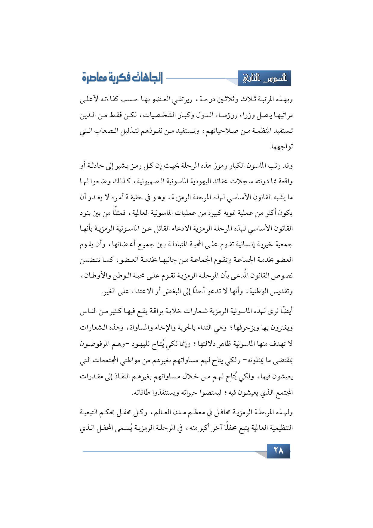 وقد رتب الماسون الكبار رموز هذه المرحلة بحيث إ ن كل رمز يشير إلى حادثة أو واقعة مما دونته سجلات عقائد اليهودية الماسونية الصهيونية، كذلك وضعوا لها ما يشبه القانون الأساسي لهذه المرحلة الرمزية، وهو في حقيقة أمره لا يعدو أن يكون أكثر من عملية تمويه كبيرة من عمليات الماسونية العالمية، فمثل ً امن بين بنود القانون الأساسي لهذه المرحلة الرمزية الادعاء القائل عن الماسونية الرمزية بأنها جمعية خيرية إنسانية تقود على المحبة المتبادلة بين جميع أعضا ئ ها، وأن يقوم العضو بخدمة الجماعة وتقوم الجماعة من جانبها بخدمة العضو، كما تتضمن نصوص القانون المُدعى بأن المرحلة الرمزية تقوم على محبة الوطن والأوطان، وتقديس الوطنية، وأنها لا تدعو أحدًا إلى البغض أو الاعتداء على الغير.