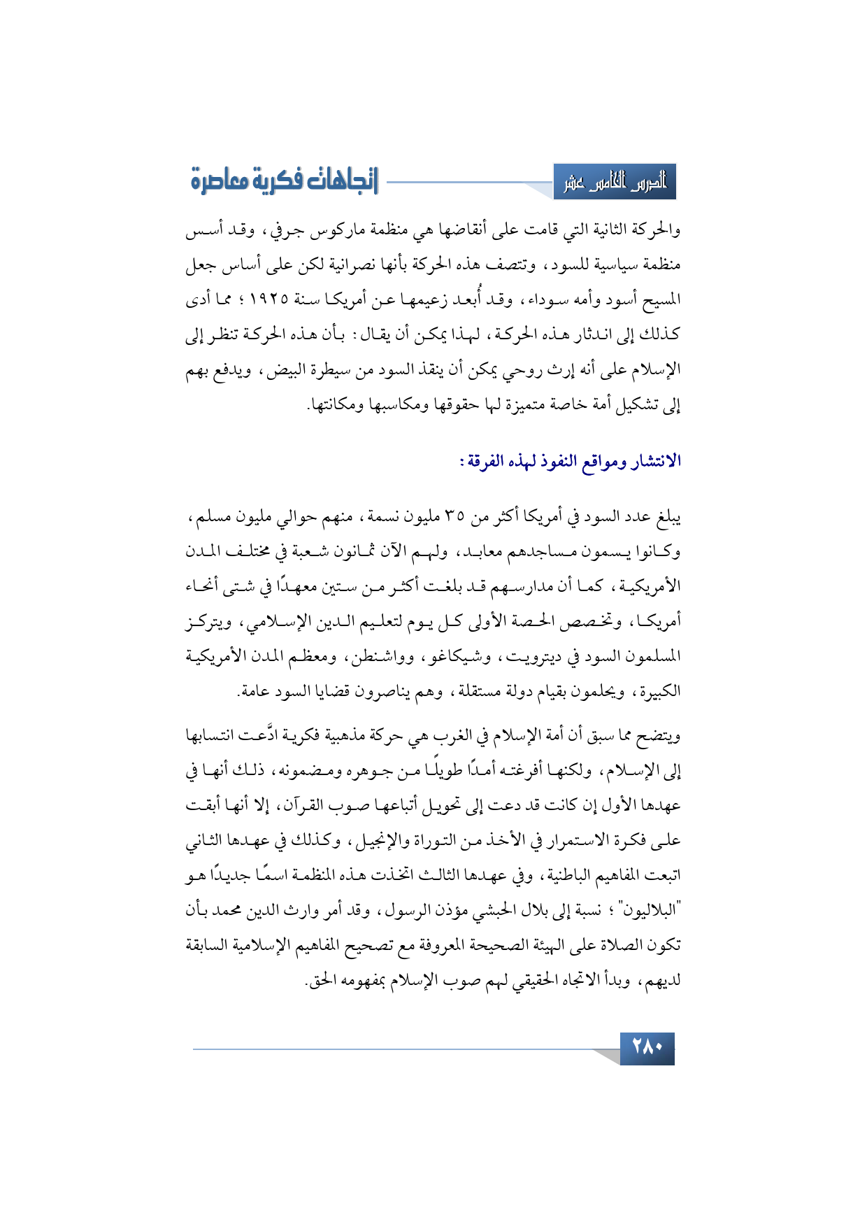 يبلغ عدد السود في أمريكا أكثر من 35 مليون نسمة، منهم حوالي مليون مسلم، وكانوا يسمون مساجدهم معابد، ولهم الآن ثمانون شعبة في مختلف المدن الأمريكية، كما أن مدارسهم قد بلغت أكثر من ستين معهدًا في شتى أنحاء أمريكا، وتخصص الحصة الأولى كل يوم لتعليم الدين الإسلامي، ويتركز المسلمون السود في ديترويت، وشيكاغو، وواشنطن، ومعظم المدن الأمريكية الكبيرة، ويحلمون بقيام دولة مستقلة، وهم يناصرون قضايا السود عامة.
