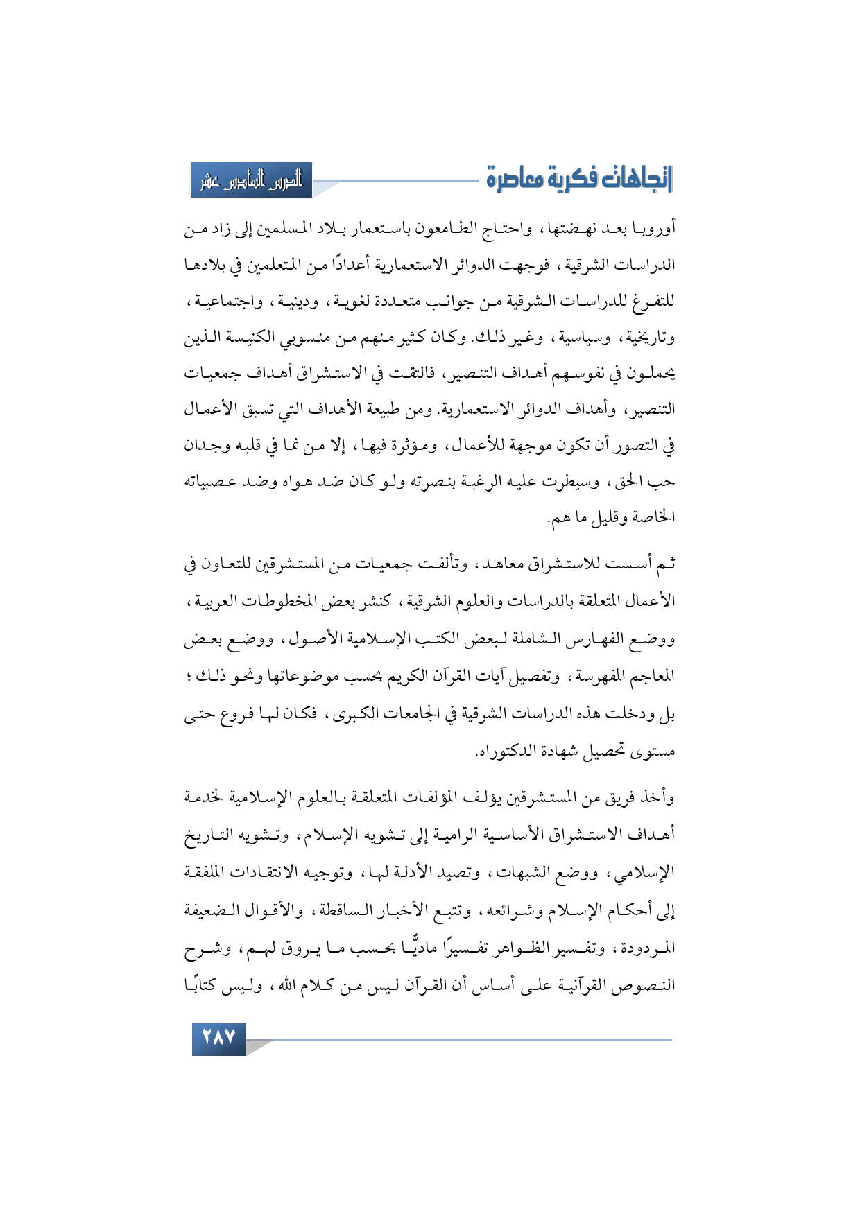 أوربا بعد نهضتها، واحتاج الطامعون باستعمار بلاد المسلمين إلى زاد من الدراسات الشرقية، فوجهت الدوائر الاستعمارية أعدادًا من المتعلمين في بلادها للتفرغ للدراسات الشرقية من جوانب متعددة لغوية، ودينية، واجتماعية، وتاريخية، وسياسية، وغير ذلك. وكان كثير منهم من منسوبي الكنيسة الذين يحملون في نفوسهم أهداف التنصير، فالتقت في الاستشراق أهداف جمعيات التنصير، وأهداف الدوائر الاستعمارية. ومن طبيعة الأهداف التي تسبق الأعمال في التصور أن تكون موجهة للأعمال، ومؤثرة فيها، إلا من نما في قلبه وجدان حب الحق، وسيطرت عليه الرغبة بنصرته ولو كان ضد هواه وضد عصبياته الخاصة وقليل ما هم.