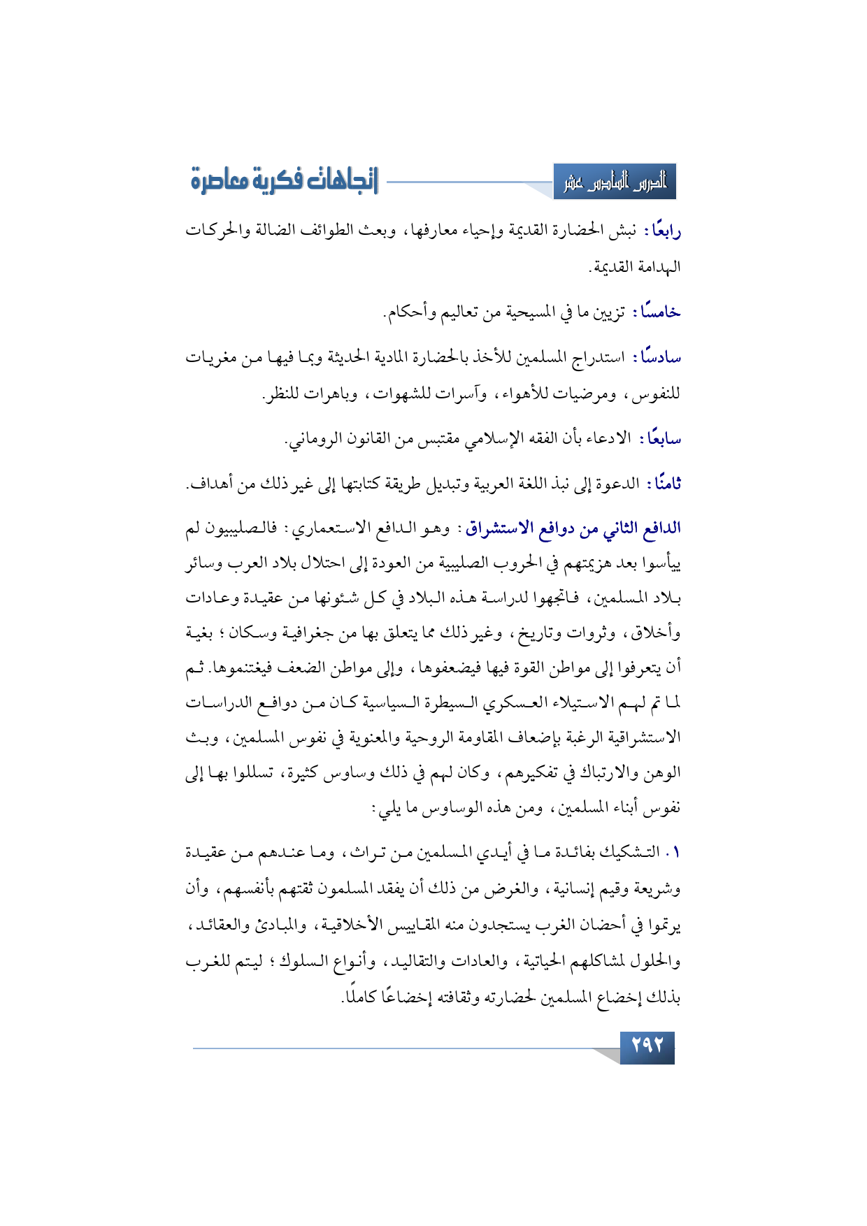 1 - التشكيك بفائدة ما في أيدي المسلمين من تراث، وما عندهم من عقيدة وشريعة وقيم إنسانية، والغرض من ذلك أن يفقد المسلمون ثقتهم بأنفسهم، وأن يرتموا في أحضان الغرب يستجدون منه المقاييس الأخلاقية، والمبادئ والعقائد، والحلول لمشاكلهم الحياتية، والعادات والتقاليد، وأنواع السلوك؛ ليتم للغرب بذلك إخضاع المسلمين لحضارته وثقافته إخضاعًا كاملًا.