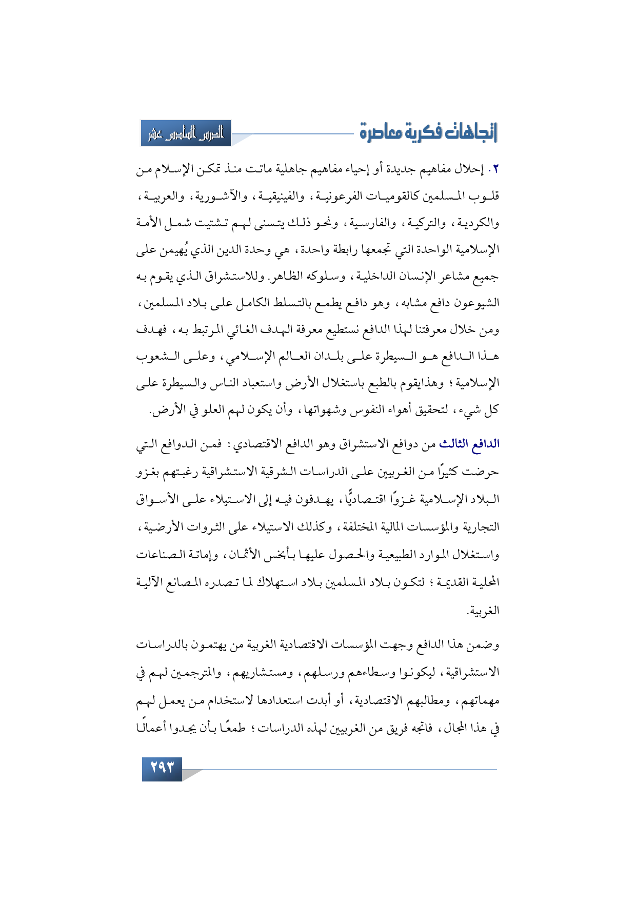 2 - إحلال مفاهيم جديدة أو إحياء مفاهيم جاهلية ماتت منذ تمكن الإسلام من قلوب المسلمين كالقوميات الفرعونية، والفينيقية، والآشورية، والعربية، والكردية، والتركية، والفارسية، ونحو ذلك يتسنى لهم تشتيت شمل الأمة الإسلامية الواحدة التي تجمعها رابطة واحدة، هي وحدة الدين الذي يُهيمن على جميع مشاعر الإنسان الداخلية، وسلوكه الظاهر. وللاستشراق الذي يقوم به الشيوعون دافع مشابه، وهو دافع يطمع بالتسلط الكامل على بلاد المسلمين، ومن خلال معرفتنا لهذا الدافع نستطيع معرفة الهدف الغائي المرتبط به، فهدف هذا الدافع هو السيطرة على بلدان العالم الإسلامي، وعلى الشعوب الإسلامية؛ طبعًا باستغلال الأرض واستعباد الناس والسيطرة على كل شيء، لتحقيق أهواء النفوس وشهواتها، وأن يكون لهم العلو في الأرض.