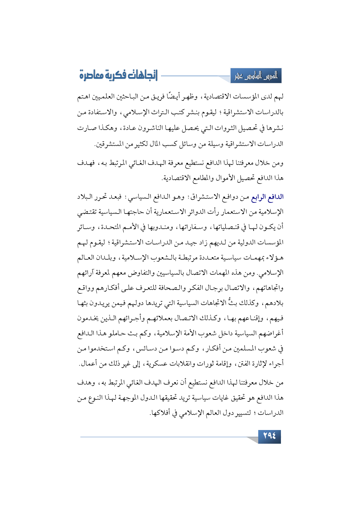 الدافع الرابع من دوافع الاستشراق: وهو الدافع السياسي: فبعد تحرر البلاد الإسلامية من الاستعمار رأت الدوائر الاستعمارية أن حاجتها السياسية تقتضي أن يكون لها في قنصلياتها، وسفاراتها، ومندوبها في الأمم المتحدة، وسائر المؤسسات الدولية من لديهم زاد جيد من الدراسات الاستشراقية؛ ليقوم لهم هؤلاء بمهمات سياسية متعددة مرتبطة بالشعوب الإسلامية، وبلدان العالم الإسلامي. ومن هذه المهمات الاتصال بالسياسيين والتفاوض معهم لمعرفة آرائهم واتجاهاتهم، والاتصال برجال الفكر والصحافة للتعرف على أفكارهم وواقع بلادهم، وكذلك بثُّ الاتجاهات السياسية التي تريدها دولهم فيمن يريدون بثها فيهم، وإقناعهم بها، وكذلك الاتصال بعملائهم وأجرائهم الذين يخدمون أغراضهم السياسية داخل شعوب الأمة الإسلامية، وكم بث حاملو هذا الدافع في شعوب المسلمين من أفكار، وكم دسوا من دسائس، وكم استخدموا من أجراء لإثارة الفتن، وإقامة ثورات وانقلابات عسكرية، إلى غير ذلك من أعمال.