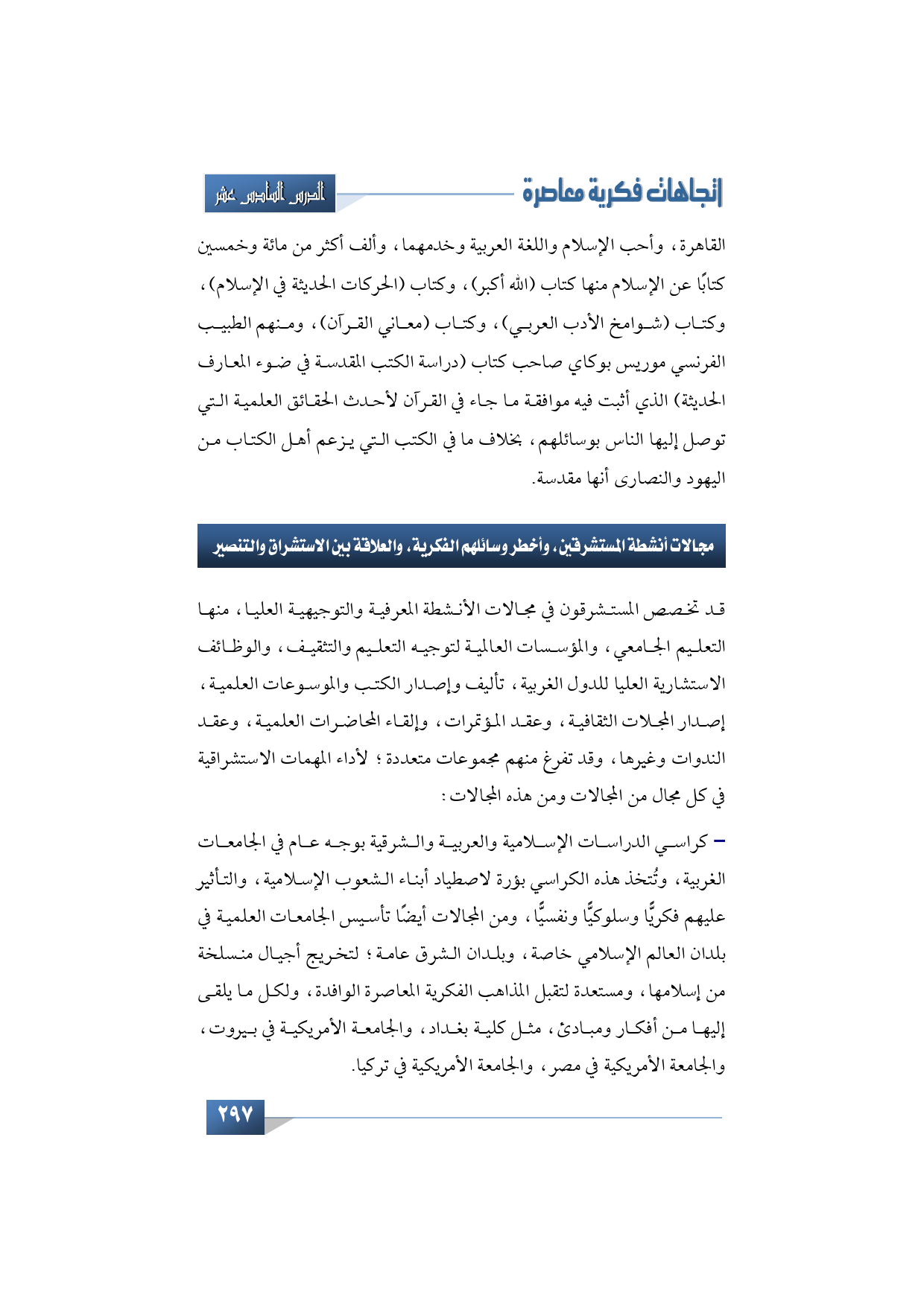 أولًا: كراسي الدراسات الإسلامية والعربية والشرقية بوجه عام في الجامعات الغربية، وتُتخذ هذه الكراسي بؤرة لاصطياد أبناء الشعوب الإسلامية، والتأثير عليهم فكريًّا وسلوكيًّا ونفسيًّا، ومن المجالات أيضًا تأسيس الجامعات العلمية في بلدان العالم الإسلامي خاصة، وبلدان الشرق عامة؛ لتخريج أجيال منسلخة من إسلامها، ومستعدة لتقبل المذاهب الفكرية المعاصرة الوافدة، ولكل ما يلقى إليها من أفكار ومبادئ، مثل كلية بغداد، والجامعة الأمريكية في بيروت، والجامعة الأمريكية في مصر، والجامعة الأمريكية في تركيا.