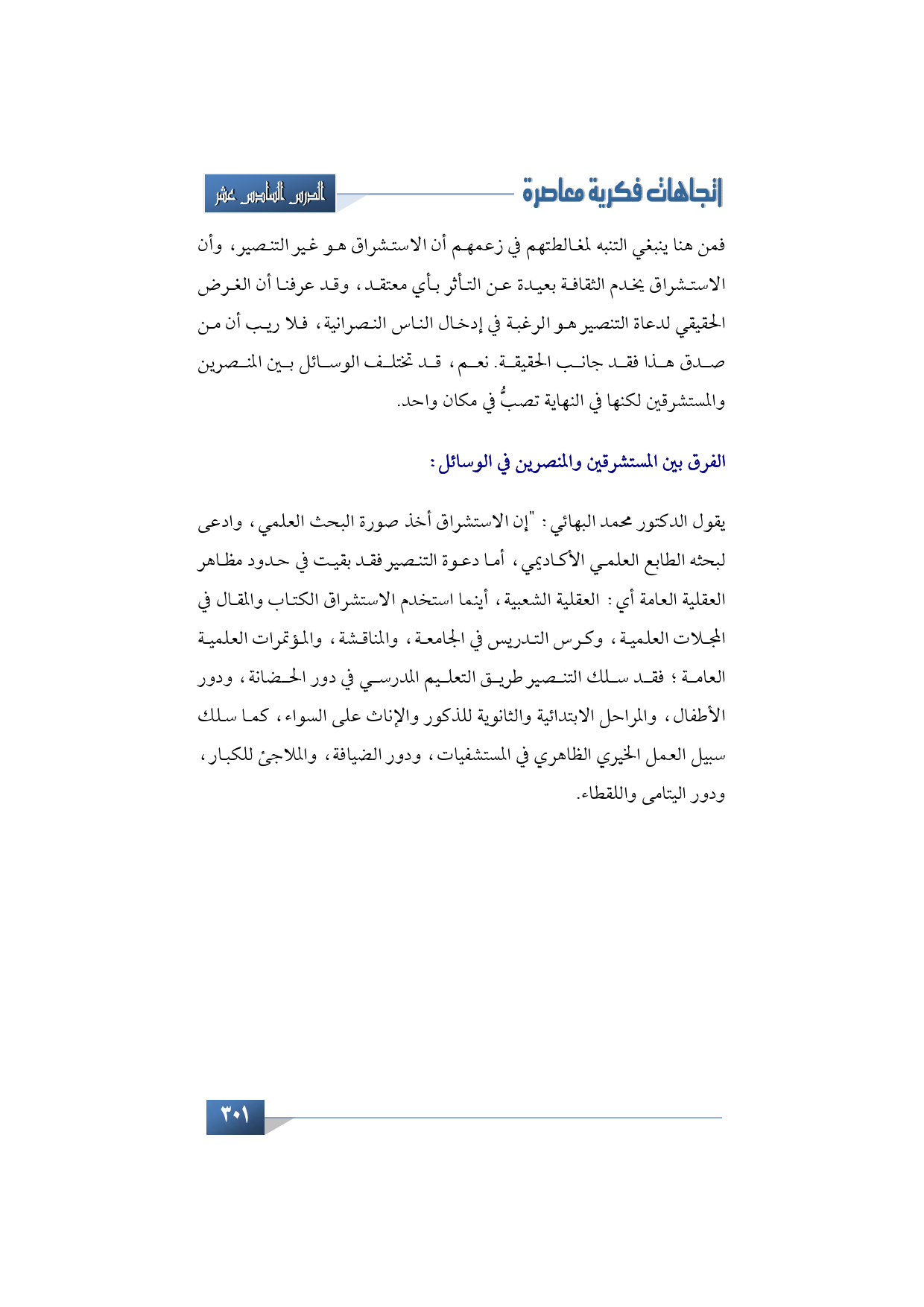 فمن هنا ينبغي التنبه لمغالطتهم في زعمهم أن الاستشراق هو غير التنصير، وأن الاستشراق يخدم الثقافة بعيدة عن التأثر بأي معتقد، وقد عرفنا أن الغرض الحقيقي لدعاة التنصير هو الرغبة في إدخال الناس النصرانية، فلا ريب أن من صدق هذا فقد جانب الحقيقة. نعم، قد تختلف الوسائل بين المنصرين والمستشرقين لكنها في النهاية تصبُّ في مكان واحد.
