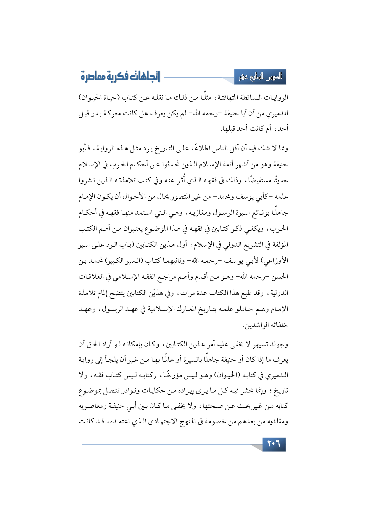 ومما لا شك فيه أن أقل الناس اطلاعًا على التاريخ يرد مثل هذه الرواية، فأبو حنيفة وهو من أشهر أئمة الإسلام الذين تحدثوا عن أحكام الحرب في الإسلام حديثًا مستفيضًا، وذلك في فقهه الذي أُثر عنه وفي كتب تلامذته الذين نشروا علمه -كأبي يوسف ومحمد- من غير المتصور بحال من الأحوال أن يكون الإمام جاهلًا بوقائع سيرة الرسول ومغازيه، وهي التي استمد منها فقهه في أحكام الحرب، ويكفي ذكر كتابين في فقهه في هذا الموضوع يعتبران من أهم الكتب المؤلفة في التشريع الدولي في الإسلام: أول هذين الكتابين (باب الرد على سير الأوزاعي) لأبي يوسف -رحمه الله، وثانيهما كتاب (السير الكبير) لمحمد بن الحسن -رحمه الله، وهو من أقدم وأهم مراجع الفقه الإسلامي في العلاقات الدولية، وقد طبع هذا الكتاب عدة مرات، وفي هذيْن الكتابين يتضح إلمام تلامذة الإمام وهم حاملو علمه بتاريخ المعارك الإسلامية في عهد الرسول، وعهد خلفائه الراشدين.