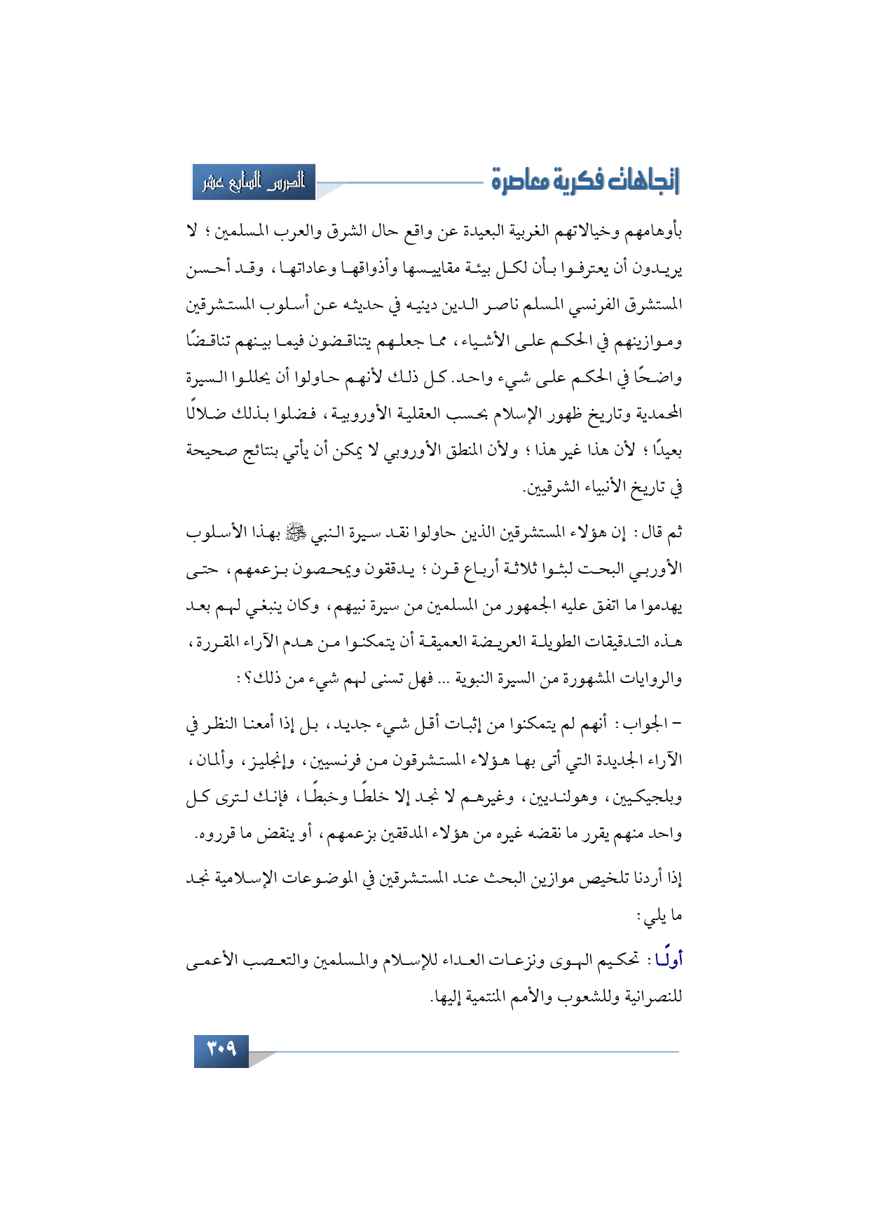 بأوهامهم وخيالاتهم الغربية البعيدة عن واقع حال الشرق والعرب المسلمين؛ لا يريدون أن يعترفوا بأن لكل بيئة مقاييسها وأذواقها وعاداتها، وقد أحسن المستشرق الفرنسي المسلم ناصر الدين دينيه في حديثه عن أسلوب المستشرقين وموازينهم في الحكم على الأشياء، مما جعلهم يتناقضون فيما بينهم تناقضًا واضحًا في الحكم على شيء واحد. كل ذلك لأنهم حاولوا أن يحللوا السيرة المحمدية وتاريخ ظهور الإسلام بحسب العقلية الأوروبية، فضلوا بذلك ضلالًا بعيدًا؛ لأن هذا غير هذا، ولأن المنطق الأوروبي لا يمكن أن يأتي بنتائج صحيحة في تاريخ الأنبياء الشرقيين.