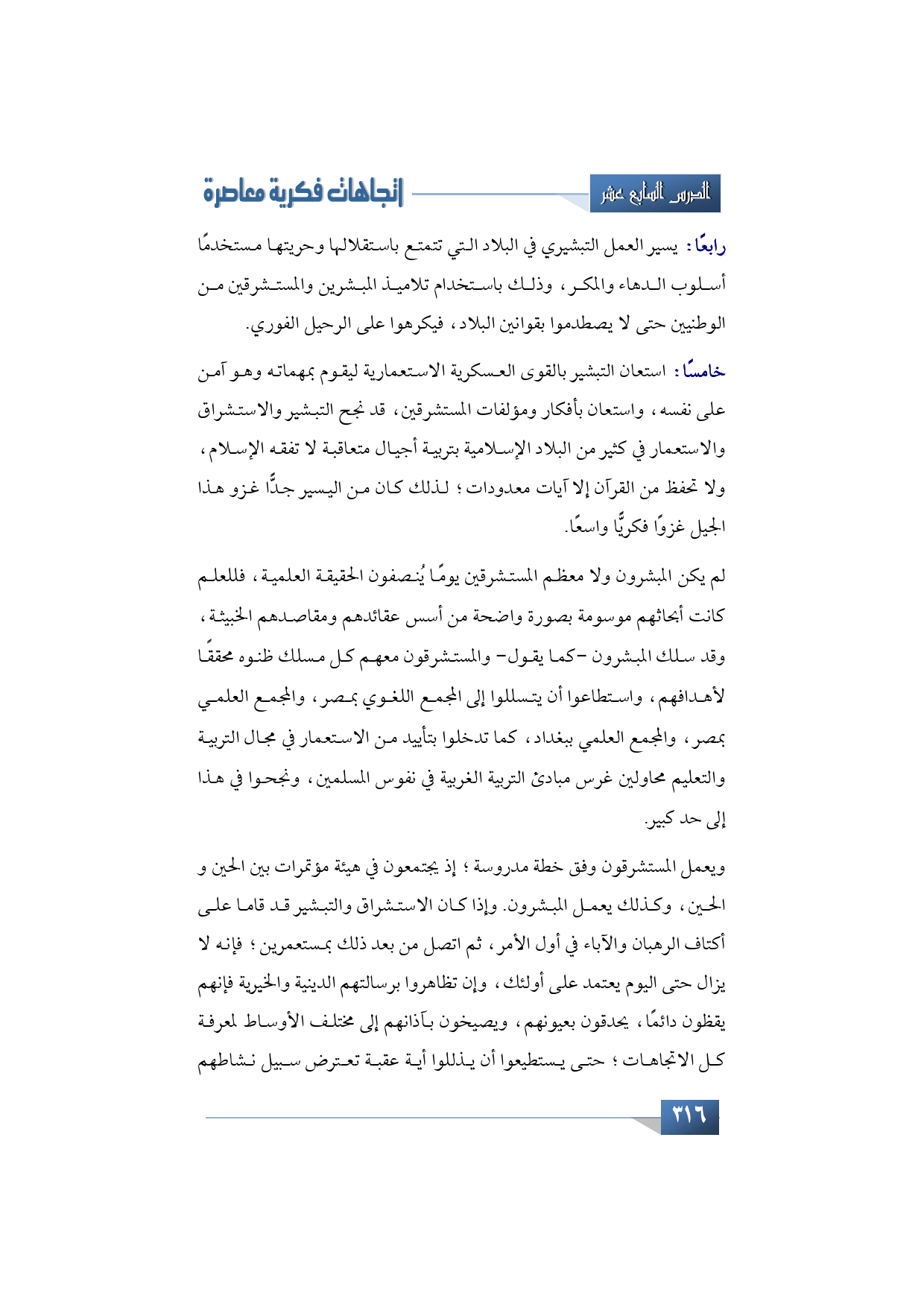 خامسًا: استعان التبشير بالقوى العسكرية الاستعمارية ليقوم بمهماته وهو آمن على نفسه، واستعان بأفكار ومؤلفات المستشرقين، قد نجح التبشير والاستشراق والاستعمار في كثير من البلاد الإسلامية بتربية أجيال متعاقبة لا تفقه الإسلام، ولا تحفظ من القرآن إلا آيات معدودات؛ لذلك كان من اليسير جدًّا غزو هذا الجيل غزوًا فكريًّا واسعًا.