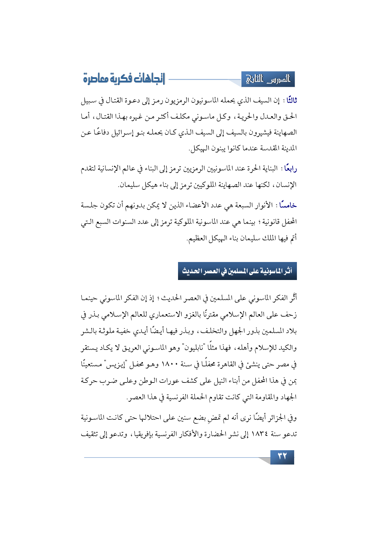 إذ إ ن الفكر الماسوني حينما زحف على العالم الإسلامي مقترنًا بالغزو الاستعماري للعالم الإسلامي بذر في بلاد المسلمين بذور الجهل والتخلف، وبذر فيها أيضًا أيدي خفية ملوثة بالشر والكيد للإسلام وأهله، فهذا مثلًا " نابليون " وهو الماسوني العريق لا يكاد يستقر في مصر حتى ينشئ في القاهرة محفلًا في سنة 1800 وهو محفل "إ يزيس " مستعينًا بمن في هذا المحفل من أبناء النيل على كشف عورات الوطن وعلى ضرب حركة الجهاد والمقاومة التي كانت تقاوم الحملة الفرنسية في هذا العصر.