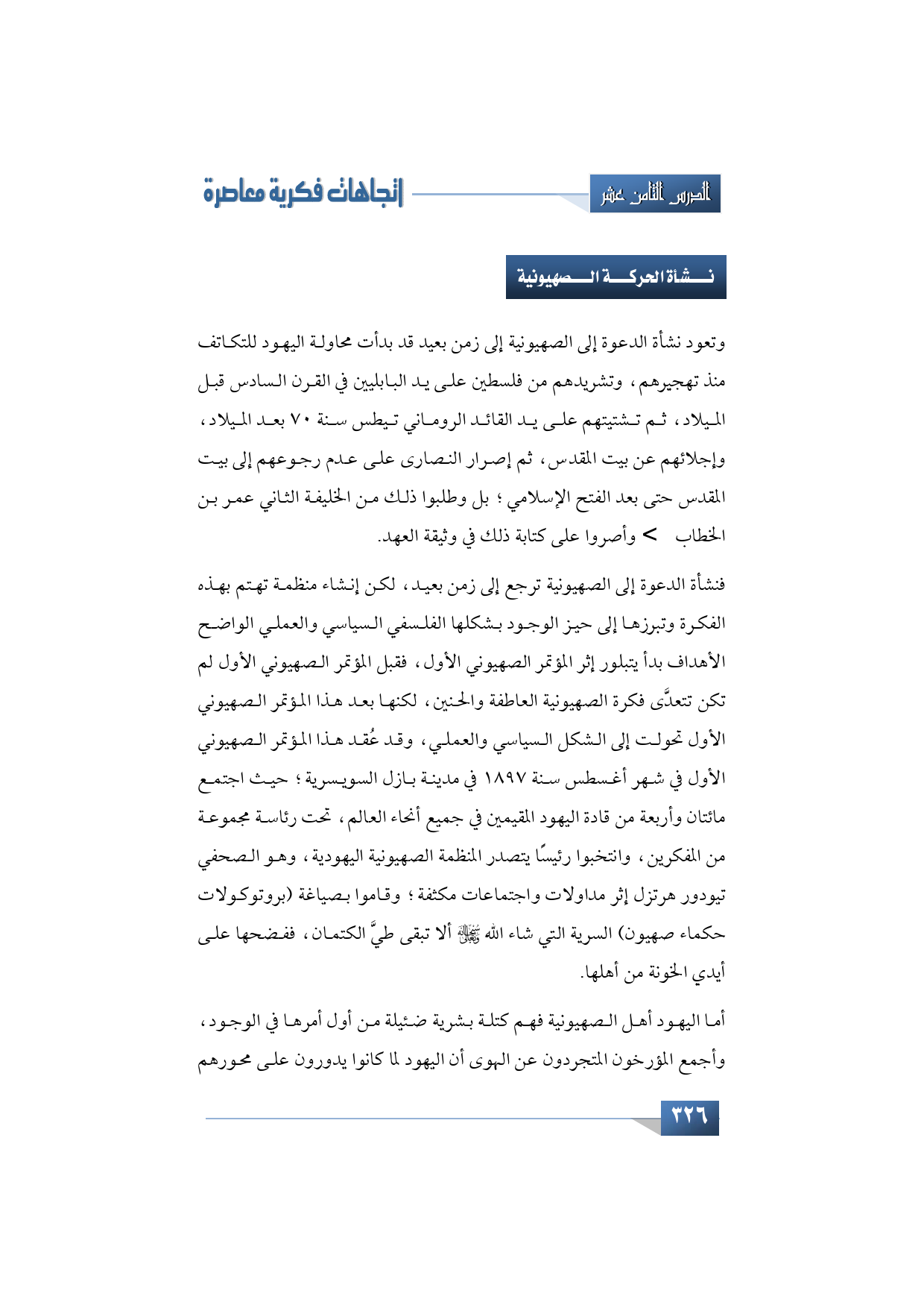 وتعود نشأة الدعوة إلى الصهيونية إلى زمن بعيد قد بدأت محاولة اليهود للتكاتف منذ تهجيرهم، وتشريدهم من فلسطين على يد البابليين في القرن السادس قبل الميلاد، ثم تشتيتهم على يد القائد الروماني تيطس سنة 70 بعد الميلاد، وإجلائهم عن بيت المقدس، ثم إصرار النصارى على عدم رجوعهم إلى بيت المقدس حتى بعد الفتح الإسلامي؛ بل وطلبوا ذلك من الخليفة الثاني عمر بن الخطاب -رضي الله عنه، وأصروا على كتابة ذلك في وثيقة العهد ...