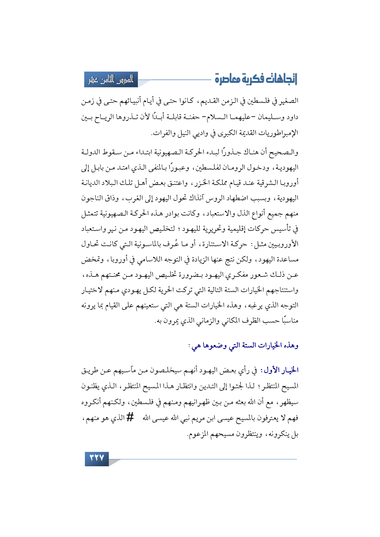 الخيار الأول: في رأي بعض اليهود أنهم سيخلصون من مآسيهم عن طريق المسيح المنتظر، لذا لجئوا إلى التدين وانتظار هذا المسيح المنتظر، الذي يظنون سيظهر، مع أن الله بعثه من بين ظهرانيهم ومنهم في فلسطين، ولكنهم أنكروه فهم لا يعترفون بالمسيح عيسى بن مريم نبي الله عيسى الله -عليه السلام- الذي هو منهم، بل ينكرونه، وينتظرون مسيحهم المزعوم.