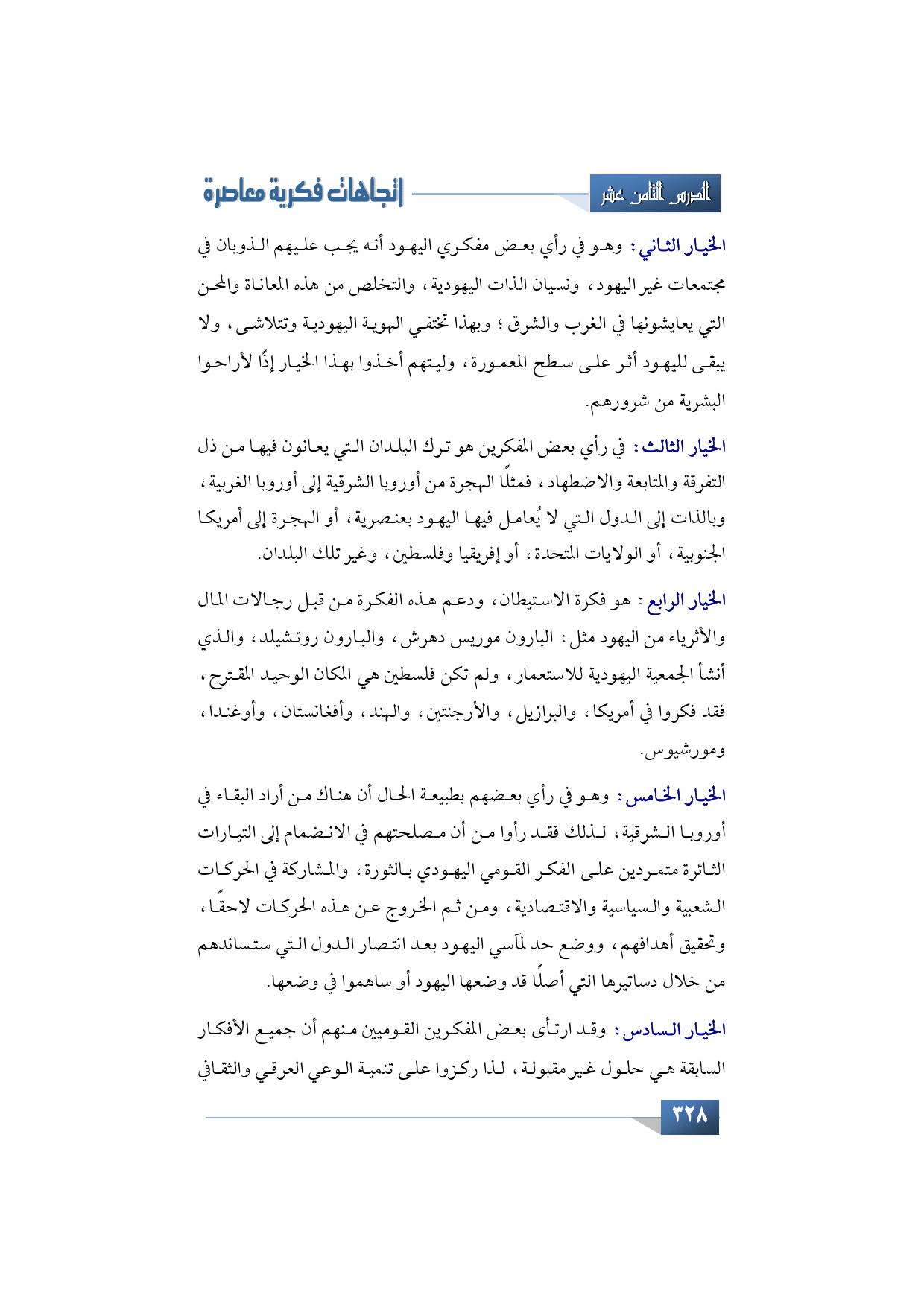 الخيار الثالث: في رأي بعض المفكرين هو ترك البلدان التي يعانون فيها من ذل التفرقة والمتابعة والاضطهاد، فمثلًا الهجرة من أوربا الشرقية إلى أوربا الغربية، وبالذات إلى الدول التي لا يُعامل فيها اليهود بعنصرية، أو الهجرة إلى أمريكا الجنوبية، أو الولايات المتحدة، أو إفريقيا وفلسطين، وغير تلك البلدان.