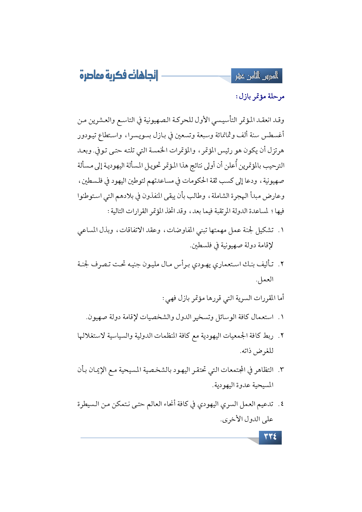 وقد انعقد المؤتمر التأسيسي الأول للحركة الصهيونية في التاسع والعشرين من أغسطس سنة ألف وثمانمائة وسبعة وتسعين في بازل بسويسرا، واستطاع تيودور هرتزل أن يكون هو رئيس المؤتمر، والمؤتمرات الخمسة التي تلته حتى توفي. وبعد الترحيب بالمؤتمرين أُعلن أن أول نتائج هذا المؤتمر تحويل المسألة اليهودية إلى مسألة صهيونية، ودعا إلى كسب ثقة الحكومات في مساعدتهم لتوطين اليهود في فلسطين، وعارض مبدأ الهجرة الشاملة، وطالب بأن يبقى المنفذون في بلادهم التي استوطنوا فيها؛ لمساعدة الدولة المرتقبة فيما بعد، وقد اتخذ المؤتمر القرارات التالية: