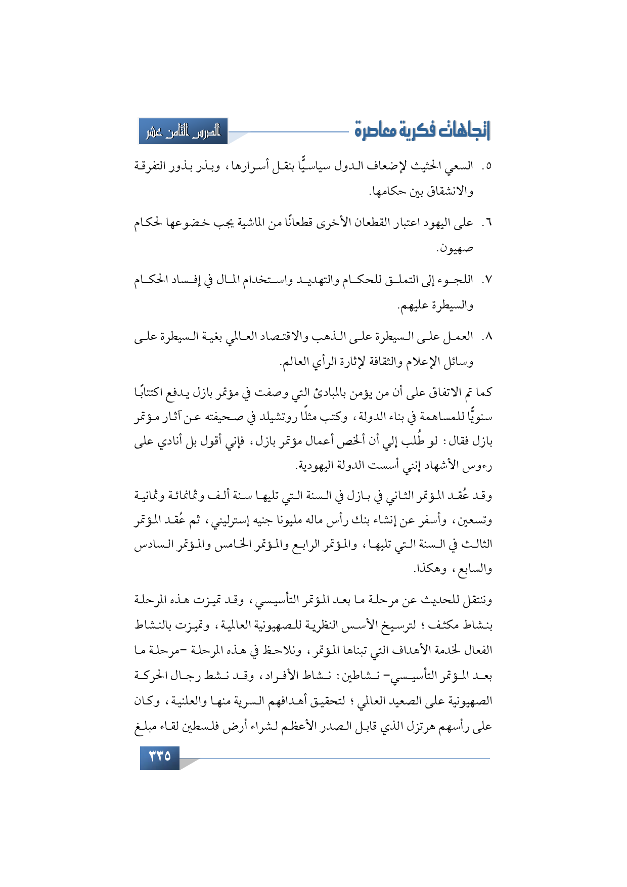 أنتقل للحديث عن مرحلة ما بعد المؤتمر التأسيسي، وقد تميزت هذه المرحلة بنشاط مكثف؛ لترسيخ الأسس النظرية للصهيونية العالمية، وتميزت بالنشاط الفعال لخدمة الأهداف التي تبناها المؤتمر، ونلاحظ في هذه المرحلة -مرحلة ما بعد المؤتمر التأسيسي- نشاطان: نشاط الأفراد، وقد نشط رجال الحركة الصهيونية على الصعيد العالمي؛ لتحقيق أهدافهم السرية منها والعلنية، وكان على رأسهم هرتزل الذي قابل الصدر الأعظم لشراء أرض فلسطين لقاء مبلغ