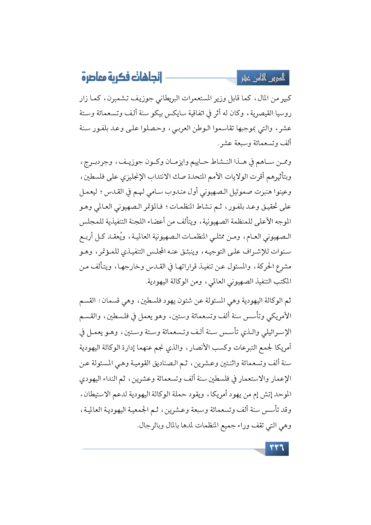 ثم الوكالة اليهودية وهي المسئولة عن شئون يهود فلسطين، وهي قسمان: القسم الأمريكي وتأسس سنة ألف وتسعمائة وستين، وهو يعمل في فلسطين، والقسم الإسرائيلي والذي تأسس سنة ألف وتسعمائة وستة وستين، وهو يعمل في أمريكا لجمع التبرعات وكسب الأنصار، والذي نجم عنهما إدارة الوكالة اليهودية سنة ألف وتسعمائة واثنتان وعشرين، ثم الصناديق القومية وهي المسئولة عن الإعمار والاستعمار في فلسطين سنة ألف وتسعمائة وعشرين، ثم النداء اليهودي الموحد إتش إم من يهود أمريكا، ويقود حملة الوكالة اليهودية لدعم الاستيطان، وقد تأسس سنة ألف وتسعمائة وسبعة وعشرين، ثم الجمعية اليهودية العالمية، وهي التي تقف وراء جميع المنظمات لمدها بالمال وبالرجال.