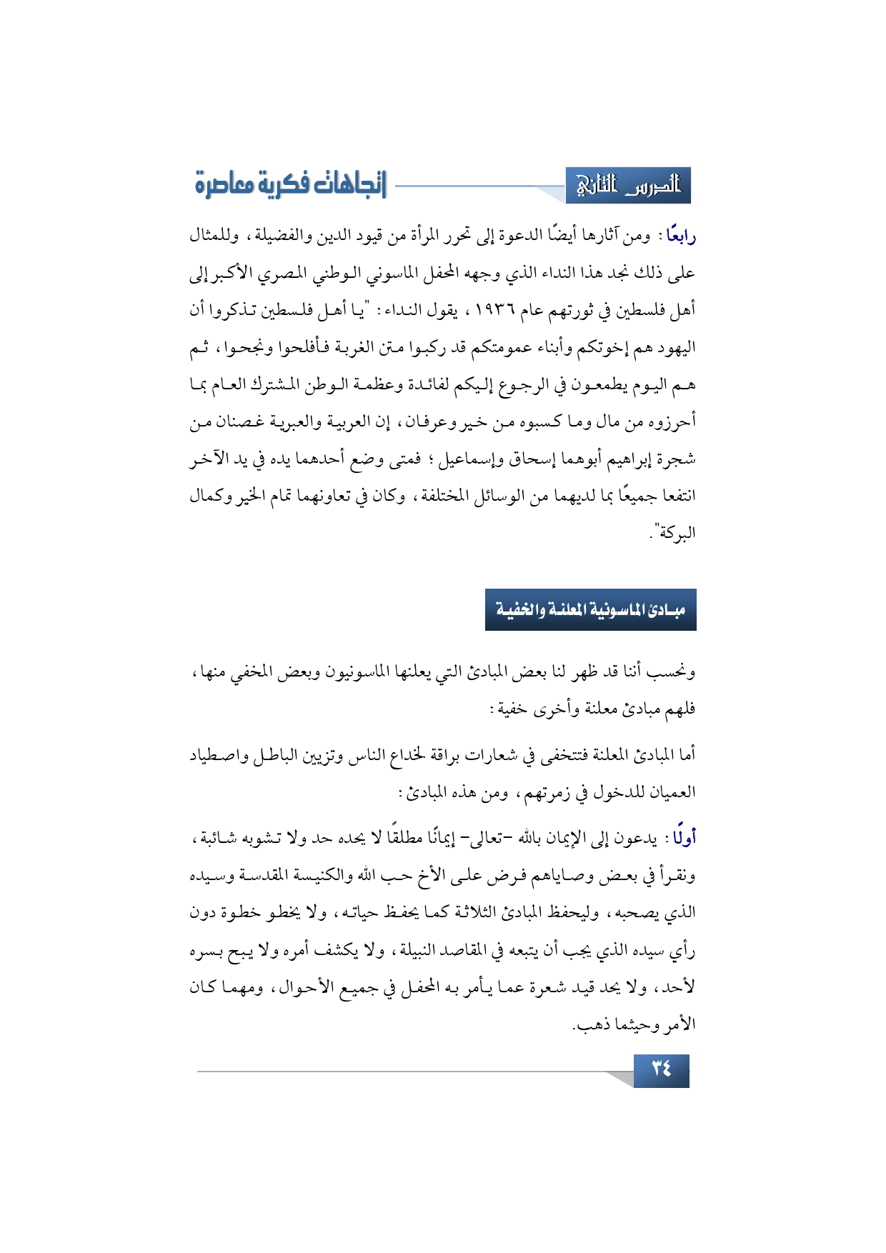 رابعًا: ومن آثارها أيضًا الدعوة إلى تحرر المرأة من قيود الدين والفضيلة، وللمثال على ذلك نجد هذا النداء الذي وجهه المحفل الماسوني الوطني المصري الأكبر إلى أهل فلسطين في ثورتهم عام 1936، يقول النداء: يا أهل فلسطين تذكروا أن اليهود هم إخوتكم وأبناء عمومتكم قد ركبوا متن الغربة فأفلحوا ونجحوا، ثم هم اليوم يطمعون في الرجوع إليكم لفائدة وعظمة الوطن المشترك العام بما أحرزوه من مال وما كسبوه من خير وعرفان، إن العربية والعبرية غصنان من شجرة إبراهيم أبوهما إسحاق وإسماعيل؛ ف متى وضع أحدهما يده في يد الآخر انتفعا جميعًا بما لديهما من الوسائل المختلفة، وكان في تعاونهما تمام الخير وكمال البركة.