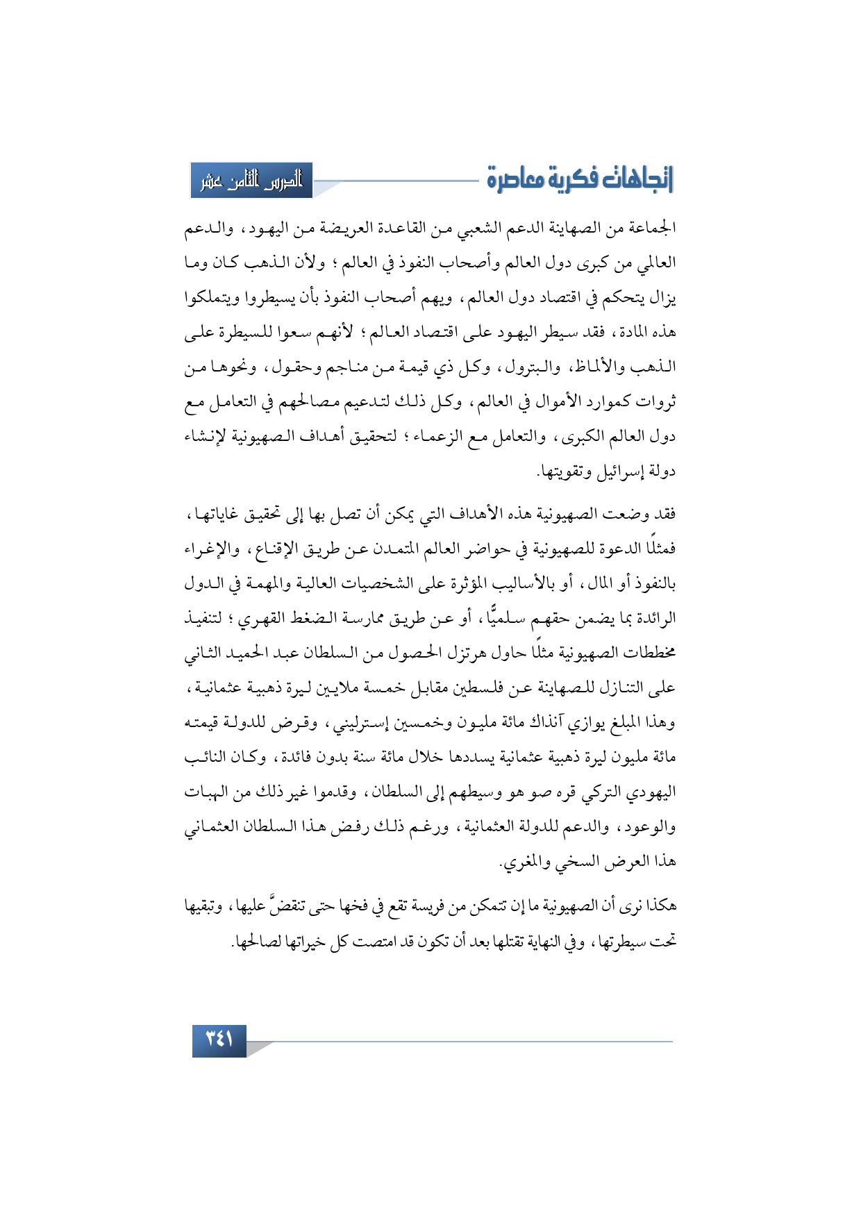 فقد وضعت الصهيونية هذه الأهداف التي يمكن أن تصل بها إلى تحقيق غاياتها، فمثلًا الدعوة للصهيونية في حواضر العالم المتمدن عن طريق الإقناع، والإغراء بالنفوذ أو المال، أو بالأساليب المؤثرة على الشخصيات العالية والمهمة في الدول الرائدة بما يضمن حقهم سلميًّا، أو عن طريق ممارسة الضغط القهري؛ لتنفيذ مخططات الصهيونية مثلًا حاول هرتزل الحصول من السلطان عبد الحميد الثاني على التنازل للصهاينة عن فلسطين مقابل خمسة ملايين ليرة ذهبية عثمانية، وهذا المبلغ يوازي آنذاك مائة مليون وخمسين إسترليني، وقرض للدولة قيمته مائة مليون ليرة ذهبية عثمانية يسددها خلال مائة سنة بدون فائدة، وكان النائب اليهودي التركي قره صو هو وسيطهم إلى السلطان، وقدموا غير ذلك من الهبات والوعود، والدعم للدولة العثمانية، ورغم ذلك رفض هذا السلطان العثماني هذا العرض السخي والمغري.