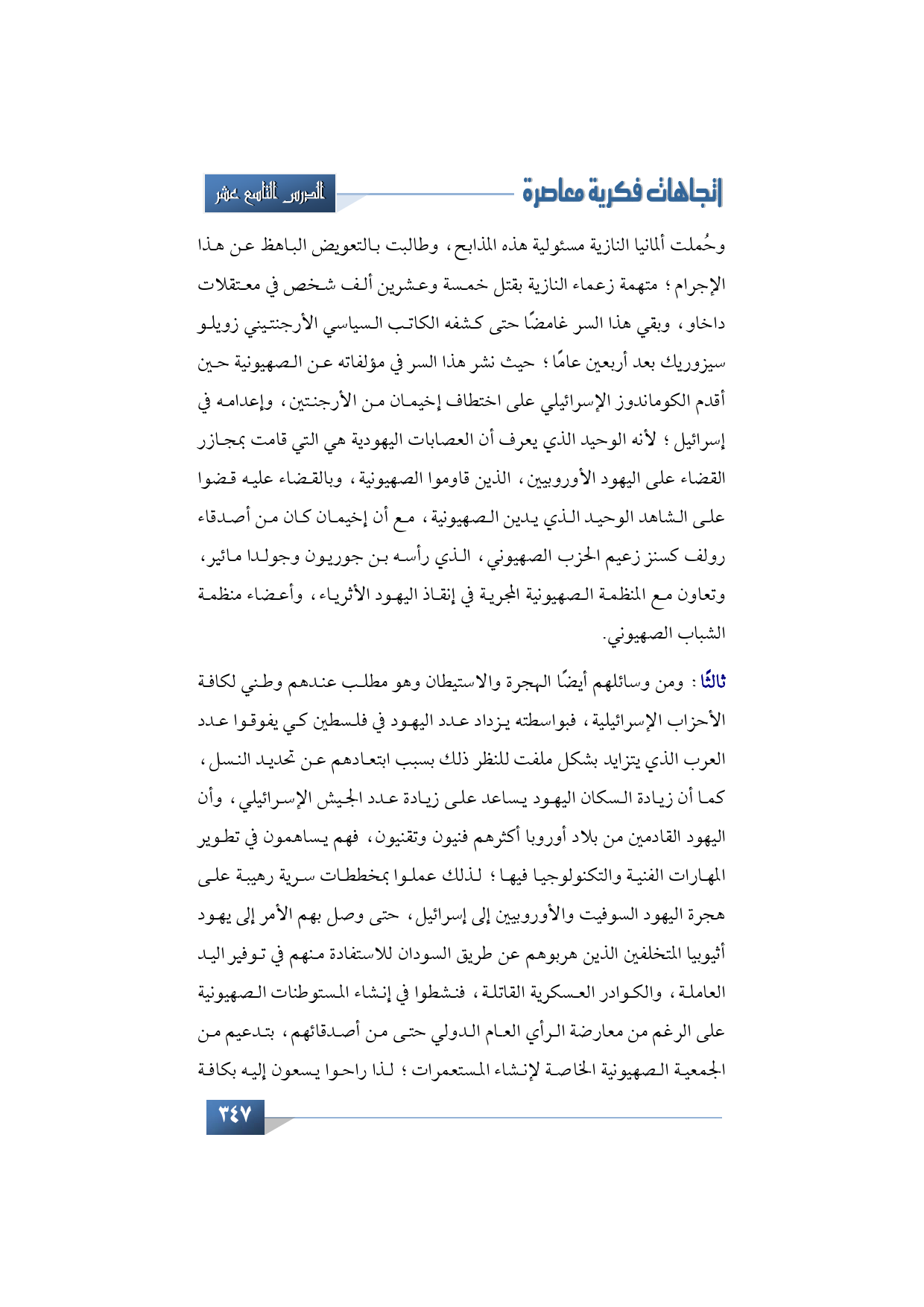 ومن وسائلهم أيضًا ثالثًا: الهجرة والاستيطان وهو مطلب عندهم وطني لكافة الأحزاب الإسرائيلية، فبواسطته يزداد عدد اليهود في فلسطين كي يفوقوا عدد العرب الذي يتزايد بشكل ملفت للنظر ذلك بسبب ابتعادهم عن تحديد النسل، كما أن زيادة السكان اليهود يساعد على زيادة عدد الجيش الإسرائيلي، وأن اليهود القادمون من بلاد أوربا أكثرهم فنيون وتقنيون، فهم يساهمون في تطوير المهارات الفنية والتكنولوجيا فيها؛ لذلك عملوا بمخططات سرية رهيبة على هجرة اليهود السوفيت والأوربيين إلى إسرائيل، حتى وصل بهم الأمر إلى يهود أثيوبيا المتخلفين الذين هربوهم عن طريق السودان للاستفادة منهم في توفير اليد العاملة، والكوادر العسكرية القاتلة، فنشطوا في إنشاء المستوطنات الصهيونية على الرغم من معارضة الرأي العام الدولي حتى من أصدقائهم، بتدعيم من الجمعية الصهيونية الخاصة لإنشاء المستعمرات؛ لذا راحوا يسعون إليه بكافة