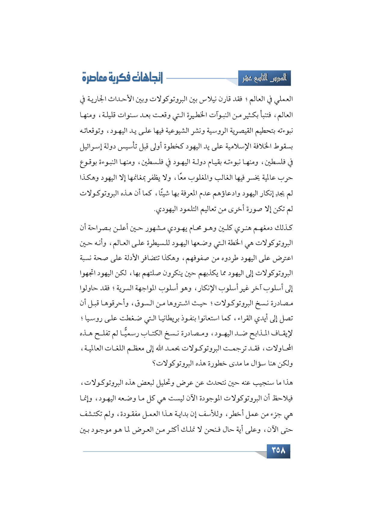 هذا ما سنجيب عنه حين نتحدث عن عرض وتحليل لبعض هذه البروتوكولات، فيلاحظ أن البروتوكولات الموجودة الآن ليست هي كل ما وضعه اليهود، وإنما هي جزء من عمل أخطر، وللأسف إن بداية هذا العمل مفقودة، ولم تكتشف حتى الآن، وعلى أية حال فنحن لا نملك أكثر من العرض لما هو موجود بين