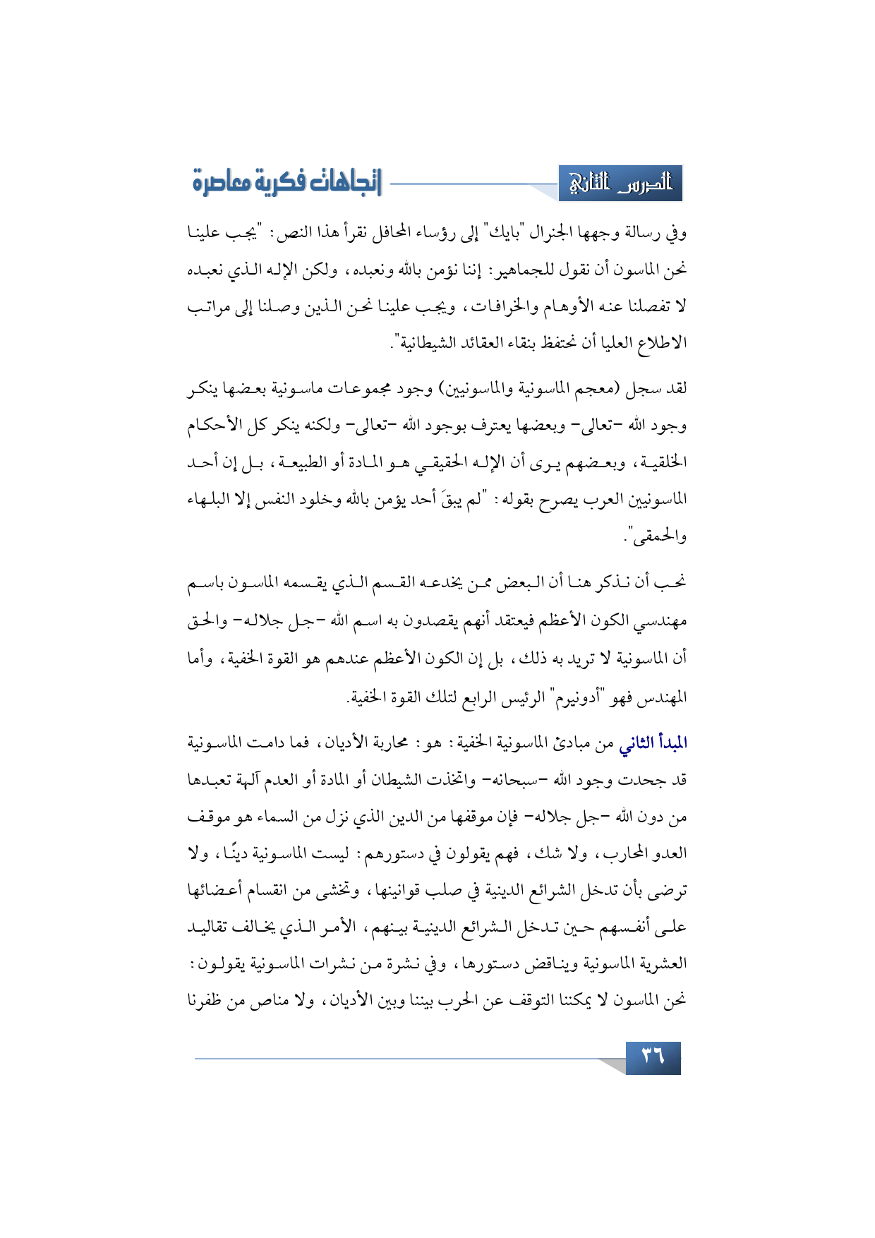 المبدأ الثاني من مبادئ الماسونية الخفية: فهو: محاربة الأديان، ف ما دامت الماسونية قد جحدت وجود الله سبحانه، واتخذت الشيطان أو المادة أو العدم آله تعبدها من دون الله جل جلاله؛ فإن موقفها من الدين الذي نزل من السماء هو موقف العدو المحارب ولا شك، ف هم يقولون في دستورهم: ليست الماسونية دينًا، ولا ترضى بأن تدخل الشرائع الدينية في صلب قوانينها، وتخشى من انقسام أعضا ئ ها على أنفسهم حين تدخل الشرائع الدينية بينهم، الأمر الذي يخالف تقاليد العشرية الماسونية ويناقض دستورها، في نشرة من نشرات الماسونية يقولون: نحن الماسون لا يمكننا التوقف عن الحرب بيننا وبين الأديان، ولا مناص من ظفرنا