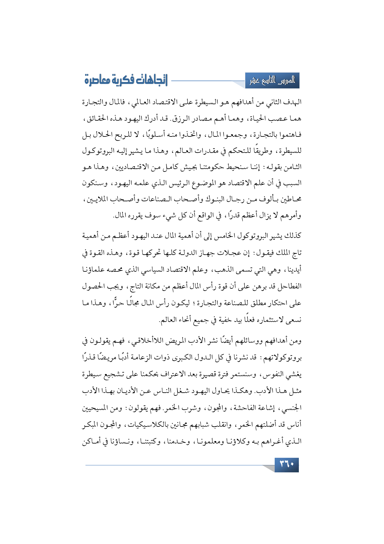 كذلك يشير البروتوكول الخامس إلى أن أهمية المال عند اليهود أعظم من أهمية تاج الملك فيقول: إن عجلات جهاز الدولة كلها تحركها قوة، وهذه القوة في أيدينا، وهي التي تسمى الذهب، وعلم الاقتصاد السياسي الذي محصه علماؤنا الفطاحل قد برهن على أن قوة رأس المال أعظم من مكانة التاج، ويجب الحصول على احتكار مطلق للصناعة والتجارة؛ ليكون رأس المال مجالًا حرًّا، وهذا ما نسعى لاستثماره فعلًا بيد خفية في جميع أنحاء العالم.