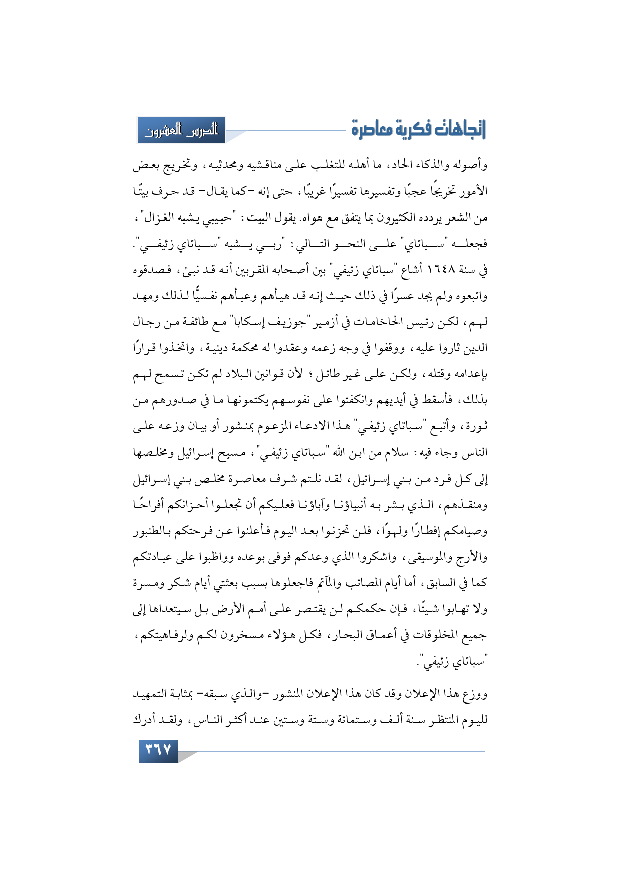 وأصوله والذكاء الحاد، ما أهله للتغلب على مناقشيه ومحدثيه، وتخريج بعض الأمور تخريجًا عجبًا وتفسيرها تفسيرًا غريبًا، حتى إنه -كما يقال- قد حرف بيتًا من الشعر يردده الكثيرون بما يتفق مع هواه. يقول البيت: "حبيبي يشبه الغزال"، فجعله "سباتاي" على النحو التالي: "ربي يشبه "سباتاي زئيفي".