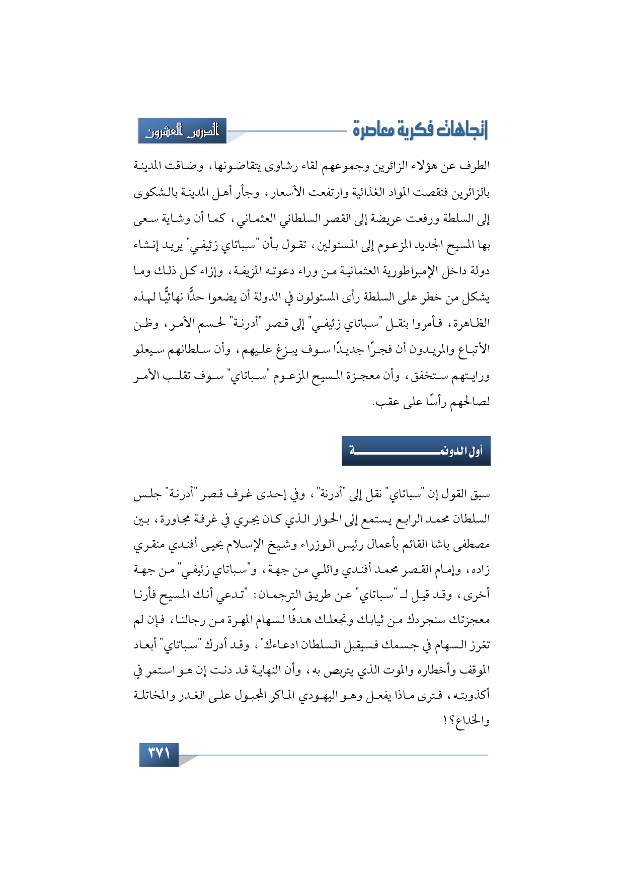 الطرف عن هؤلاء الزائرين وجموعهم لقاء رشاوى يتقاضونها، وضاقت المدينة بالزائرين فنقصت المواد الغذائية وارتفعت الأسعار، وجأر أهل المدينة بالشكوى إلى السلطة ورفعت عريضة إلى القصر السلطاني العثماني، كما أن وشاية سعى بها المسيح الجديد المزعوم إلى المسئولين، تقول بأن "سباتاي زئيفي" يريد إنشاء دولة داخل الإمبراطورية العثمانية من وراء دعوته المزيفة، وإزاء كل ذلك وما يشكل من خطر على السلطة رأى المسئولون في الدولة أن يضعوا حدًّا نهائيًّا لهذه الظاهرة، فأمروا بنقل "سباتاي زئيفي" إلى قصر أدرنه لحسم الأمر، وظن الأتباع والمريدون أن فجرًا جديدًا سوف يبزغ عليهم، وأن سلطانهم سيعلو ورايتهم ستخفق، وأن معجزة المسيح المزعوم "سباتاي" سوف تقلب الأمر لصالحهم رأسًا على عقب.