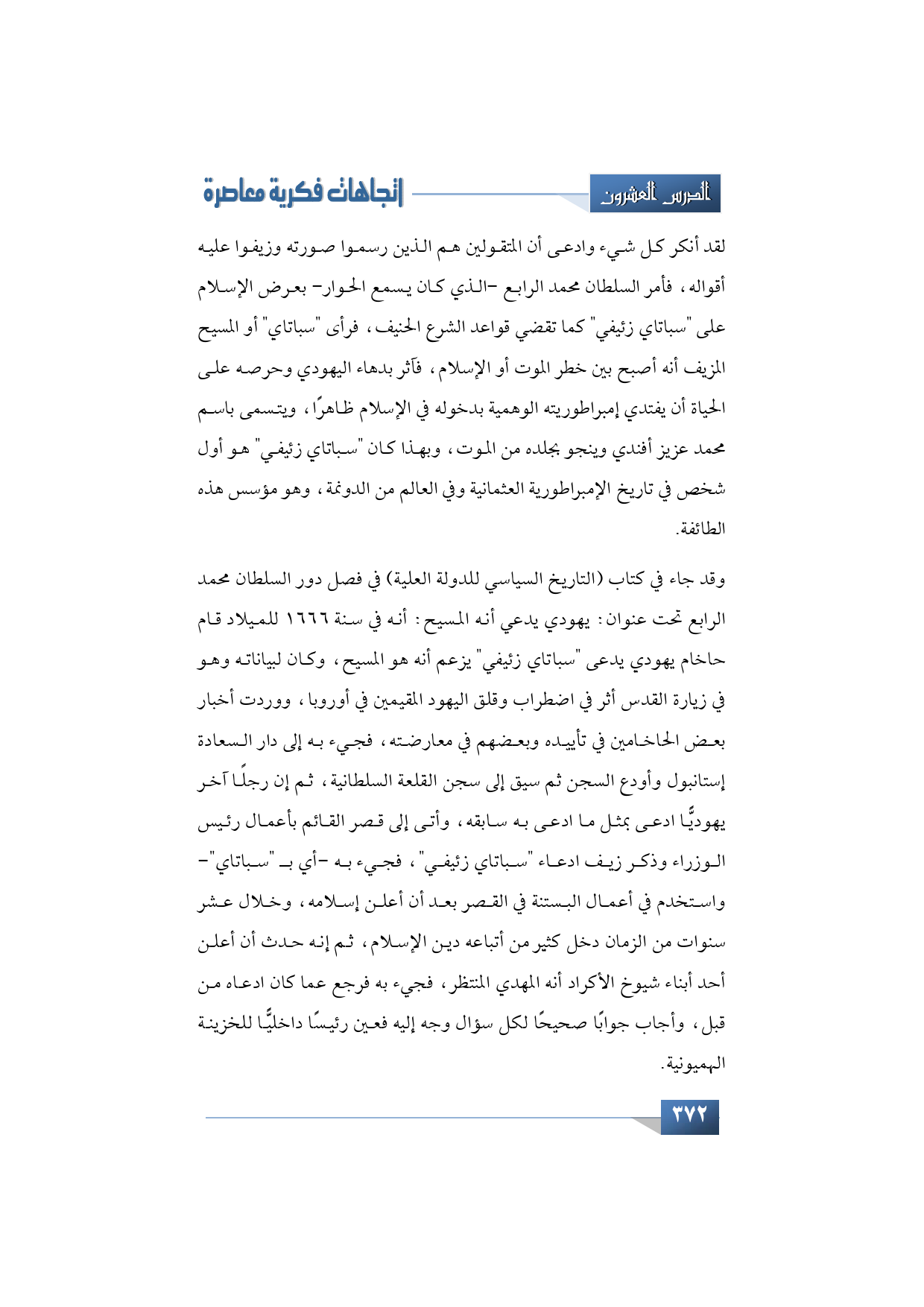 وقد جاء في كتاب (التاريخ السياسي للدولة العلية) في فصل دور السلطان محمد الرابع تحت عنوان: يهودي يدعي أنه المسيح: أنه في سنة 1666 للميلاد قام حاخام يهودي يدعى "سباتاي زئيفي" يزعم أنه هو المسيح، وكان لبياناته وهو في زيارة القدس أثر في اضطراب وقلق اليهود المقيمين في أوربا، ووردت أخبار بعض الحاخامين في تأييده وبعضهم في معارضته، فجيء به إلى دار السعادة استانبول وأودع السجن ثم سيق إلى سجن القلعة السلطانية، ثم إن رجلًا آخر يهوديًّا ادعى بمثل ما ادعى به سابقه، وأتى إلى قصر القائم بأعمال رئيس الوزراء وذكر زيف ادعاء "سباتاي زئيفي"، فجيء به -أي بـ "سباتاي"- واستخدم في أعمال البستنة في القصر بعد أن أعلن إسلامه، وخلال عشر سنوات من الزمان دخل كثير من أتباعه دين الإسلام، ثم إنه حدث أن أعلن أحد أبناء شيوخ الأكراد أنه المهدي المنتظر، فجيء به فرجع عما كان ادعاه من قبل، وأجاب جوابًا صحيحًا لكل سؤال وجه إليه فعين رئيسا داخليا للخزينة الهميونية.