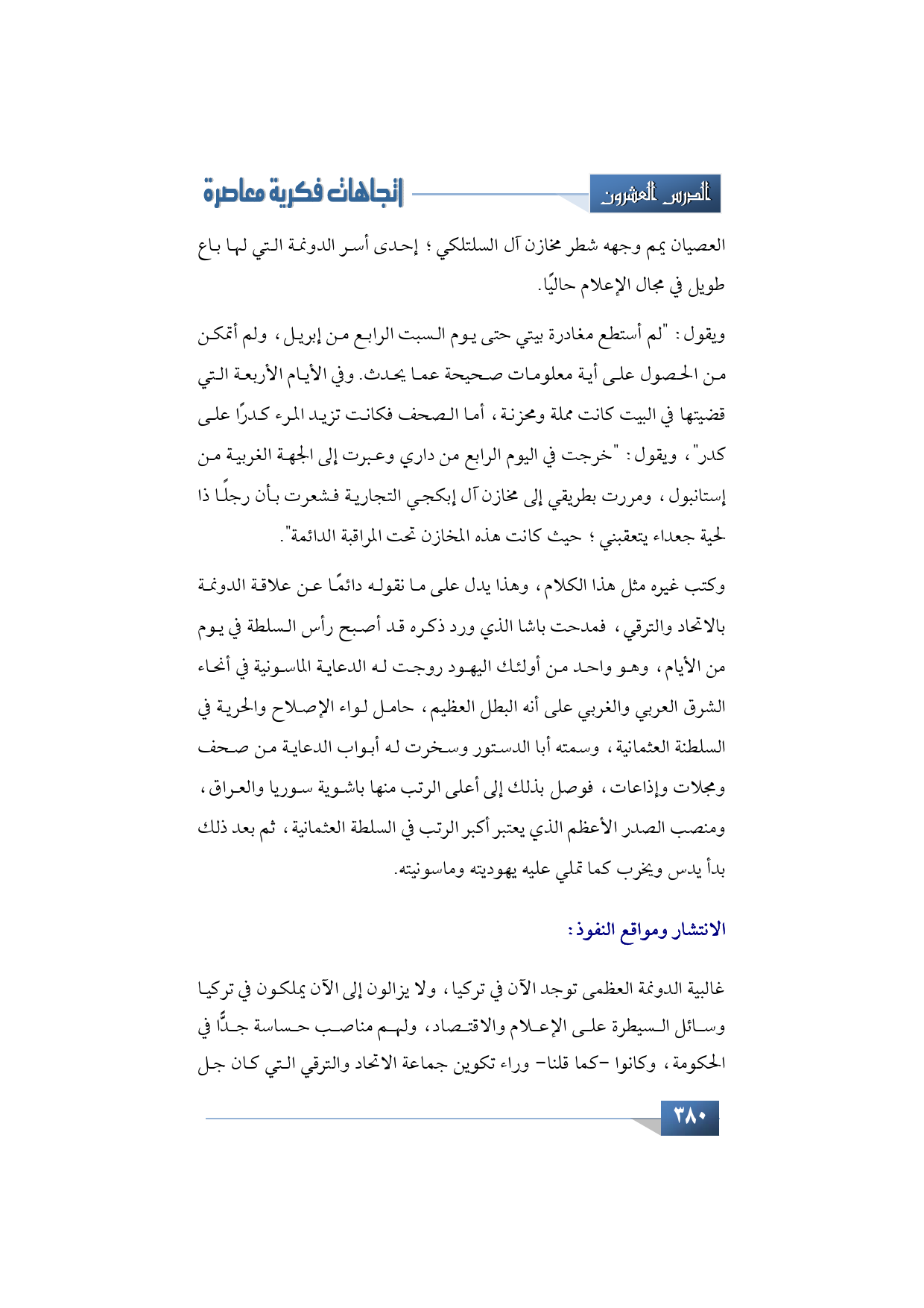 وكتب غيره مثل هذا الكلام، وهذا يدل على ما نقوله دائمًا عن علاقة الدونمة بالاتحاد والترقي، فمدحت باشا الذي ورد ذكره قد أصبح رأس السلطة في يوم من الأيام، وهو واحد من أولئك اليهود روجت له الدعاية الماسونية في أنحاء الشرق العربي والغربي على أنه البطل العظيم، حامل لواء الإصلاح والحرية في السلطنة العثمانية، وسمته أبا الدستور وسخرت له أبواب الدعاية من صحف ومجلات وإذاعات، فوصل بذلك إلى أعلى الرتب منها باشوية سوريا والعراق، ومنصب الصدر الأعظم الذي يعتبر أكبر الرتب في السلطة العثمانية، ثم بعد ذلك بدأ يدس ويخرب كما تملي عليه يهوديته وماسونيته.