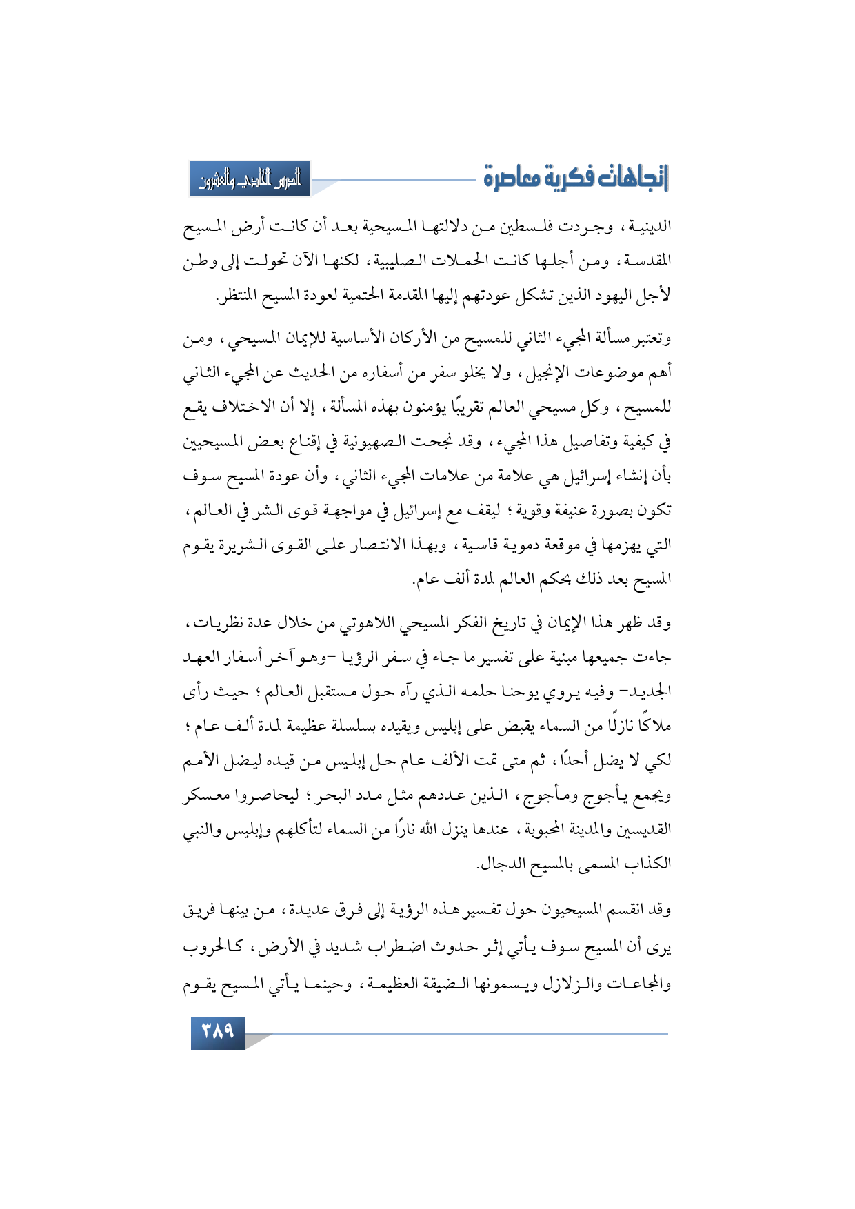 وتعتبر مسألة المجيء الثاني للمسيح من الأركان الأساسية للإيمان المسيحي، ومن أهم موضوعات الإنجيل، ولا يخلو سفر من أسفاره من الحديث عن المجيء الثاني للمسيح، وكل مسيحي العالم تقريبًا يؤمنون بهذه المسألة، إلا أن الاختلاف يقع في كيفية وتفاصيل هذا المجيء، وقد نجحت الصهيونية في إقناع بعض المسيحيين بأن إنشاء إسرائيل هي علامة من علامات المجيء الثاني، وأن عودة المسيح سوف تكون بصورة عنيفة وقوية؛ ليقف مع إسرائيل في مواجهة قوى الشر في العالم، التي يهزمها في موقعة دموية قاسية، وبهذا الانتصار على القوى الشريرة يقوم المسيح بعد ذلك بحكم العالم لمدة ألف عام.
