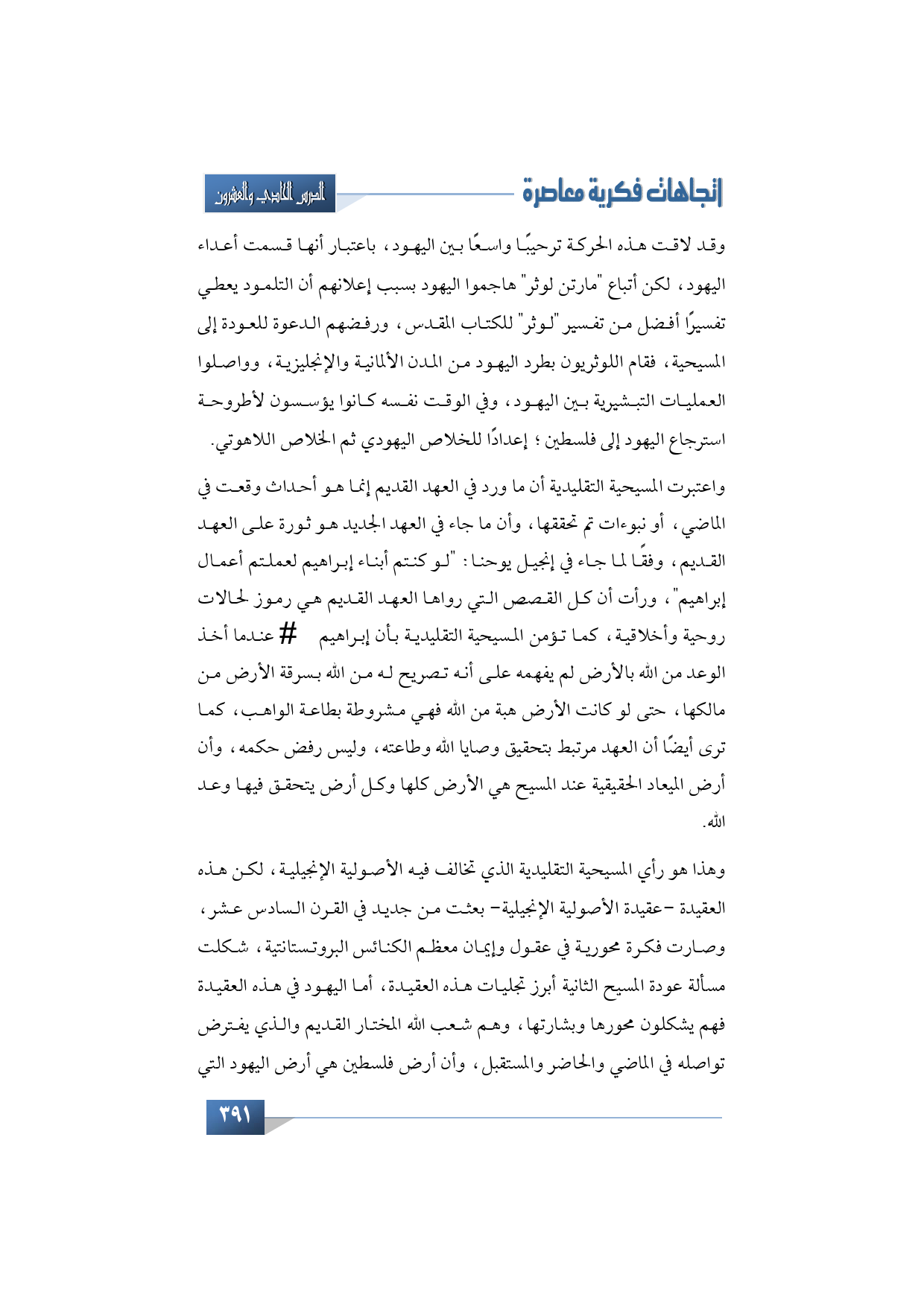 وهذا هو رأي المسيحية التقليدية الذي تخالف فيه الأصولية الإنجيلية، لكن هذه العقيدة -عقيدة الأصولية الإنجيلية- بعثت من جديد في القرن السادس عشر، وصارت فكرة محورية في عقول وإيمان معظم الكنائس البروتستنتية، شكلت مسألة عودة المسيح الثانية أبرز تجليات هذه العقيدة، أما اليهود في هذه العقيدة فهم يشكلون محورها وبشارتها، وهم شعب الله المختار القديم والذي يفترض تواصله في الماضي والحاضر والمستقبل، وأن أرض فلسطين هي أرض اليهود