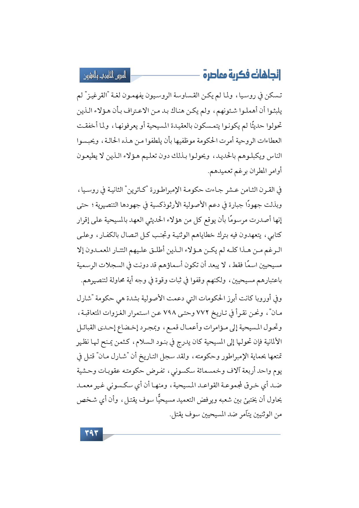 تسكن في روسيا، ولما لم يكن القساوسة الروسيون يفهمون لغة "القرغيز" لم يلبثوا أن أهملوا شئونهم، ولم يكن هناك بد من الاعتراف بأن هؤلاء الذين تحولوا حديثًا لم يكونوا يتمسكون بالعقيدة المسيحية أو يعرفونها، ولما أخفقت العطاءات الروحية أمرت الحكومة موظفيها بأن يلطفوا من هذه الحالة، ويحبسوا الناس ويكبلوهم بالحديد، ويحولوا بذلك دون تعليم هؤلاء الذين لا يطيعون أوامر المطران برغم تعميدهم.