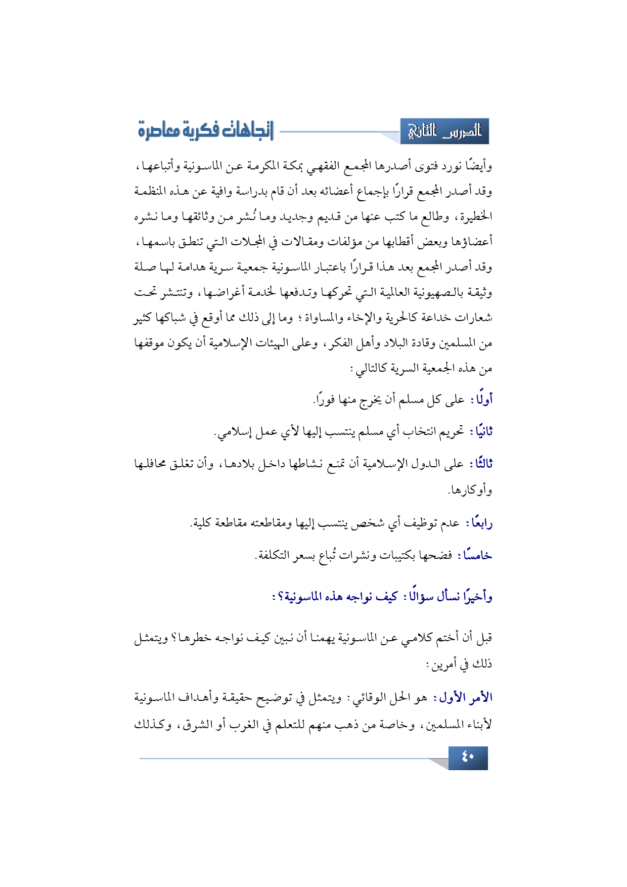 قبل أن أختم كلامي عن الماسونية يهمنا أن نبين كيف نواجه خطرها؟ ويتمثل ذلك في أمرين: