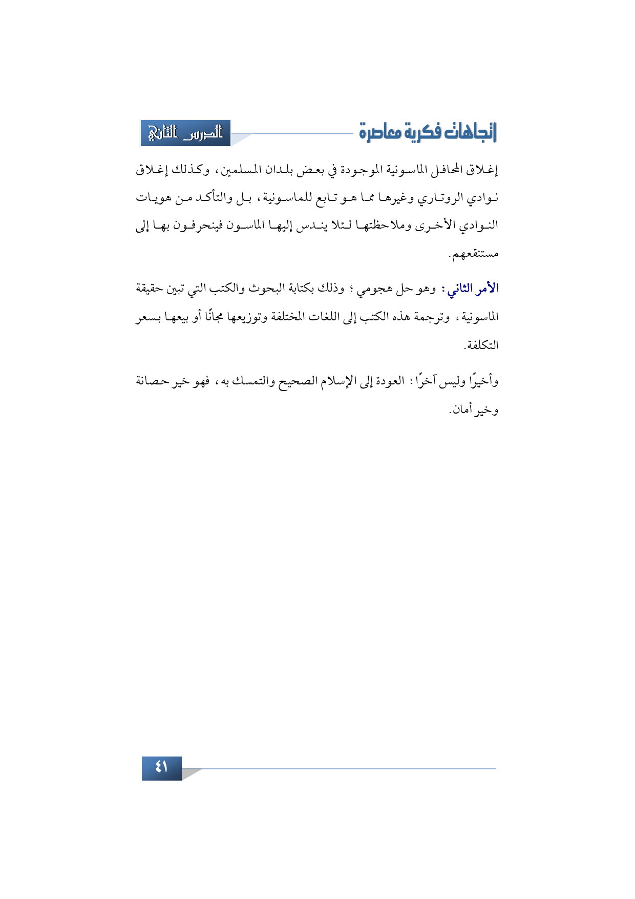 الأمر الثاني: وهو حل هجومي؛ وذلك بكتابة البحوث والكتب التي تبين حقيقة الماسونية، وترجمة هذه الكتب إلى اللغات المختلفة وتوزيعها مجانًا أو بيعها بسعر التكلفة.